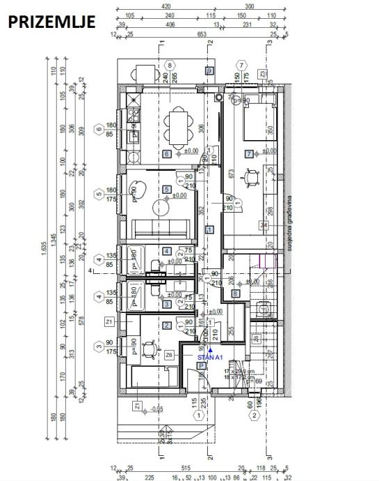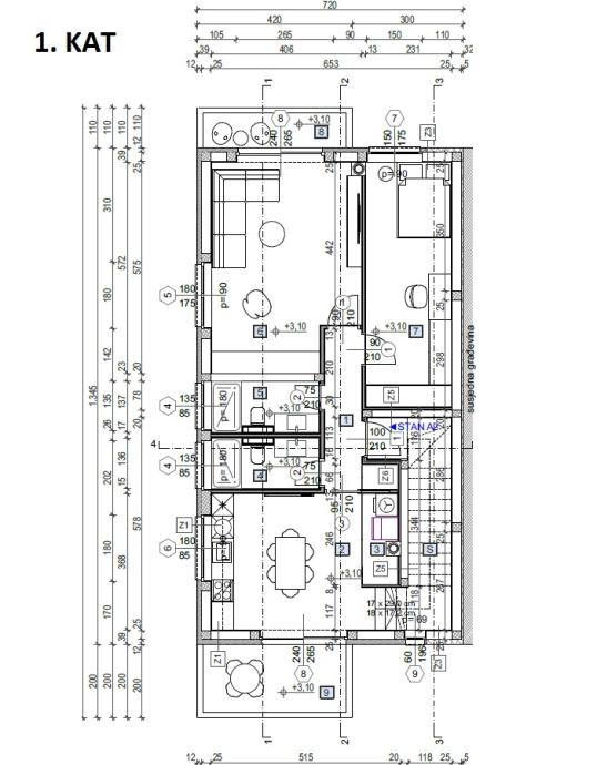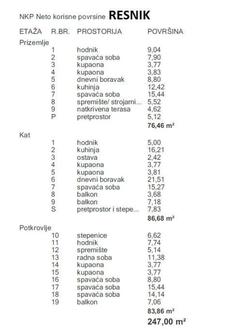 Stan dvoetažni 137m2 na 1. katu i potkrovlju: dnevni boravak, kuhinja i blagovaonica, spavaća soba, 2 kupaone, ostava te hodnik i stepenice prema potkrovlju. U potkrovlju su smještene 3 spavaće sobe, 2 kupaone, radna sobe i ostava.