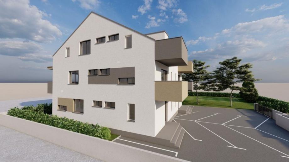 Stan visoko prizemlje 74m2: hodnika, spremišta/ strojarnice, dvije spavaće sobe, dvije kupaone, kuhinje i blagovanja te dnevnog boravka. Iz kuhinje je omogućen izlaz na vanjsku natkrivenu terasu.