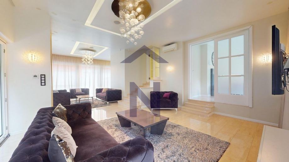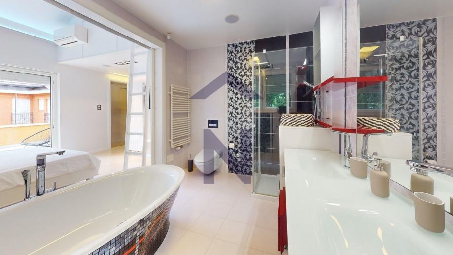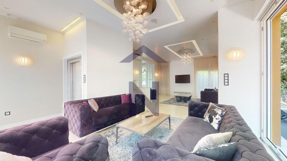 The driveway to the villa is heated, paved with Kashmir white stone, the access ramp to the garage is heated with an anti-slip finish, the outdoor terrace is paved with ceramic tiles and Travertine stone, the outdoor terrace with a barbecue area, the pool area is paved with Travertine stone. The villa is a smart home (heating, cooling, video surveillance...), with indirect and direct lighting, Murano chandeliers, underfloor and wall heating. The villa is ideal for a residence but also suitable for business purposes.