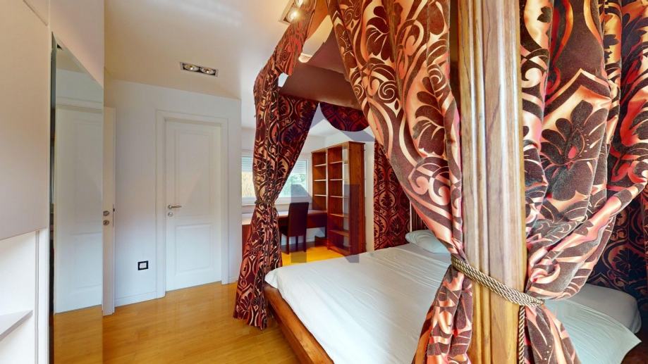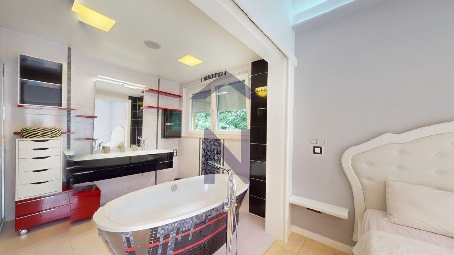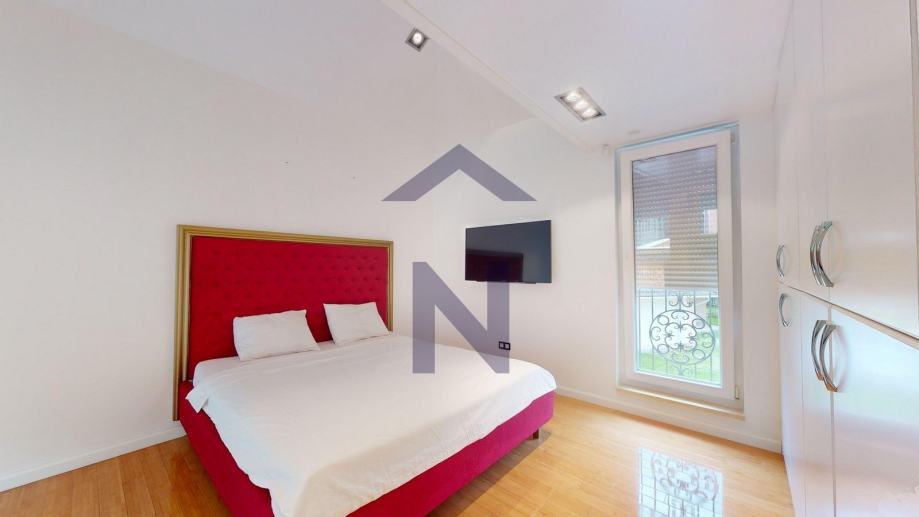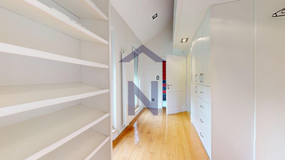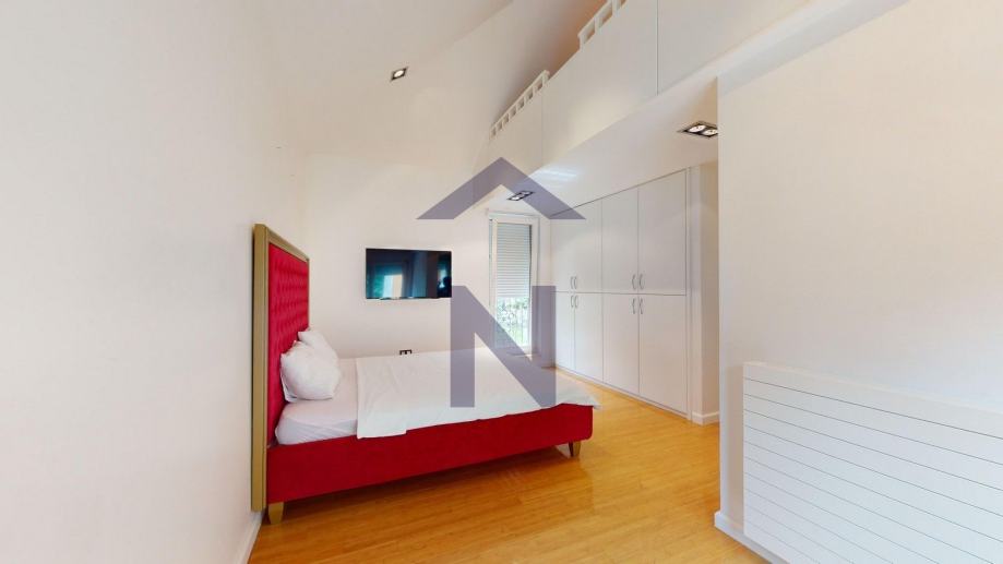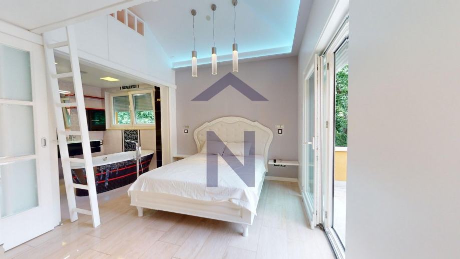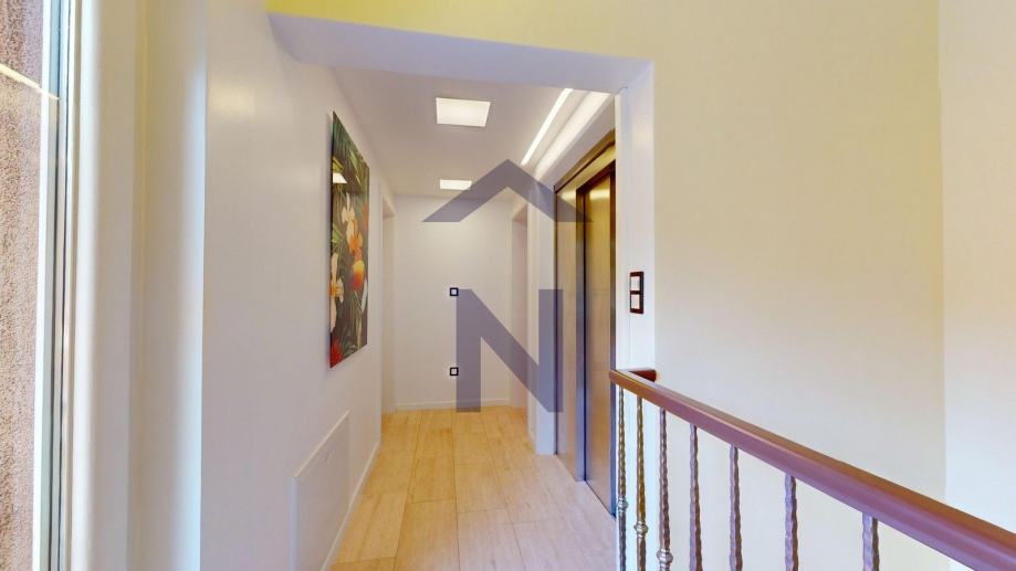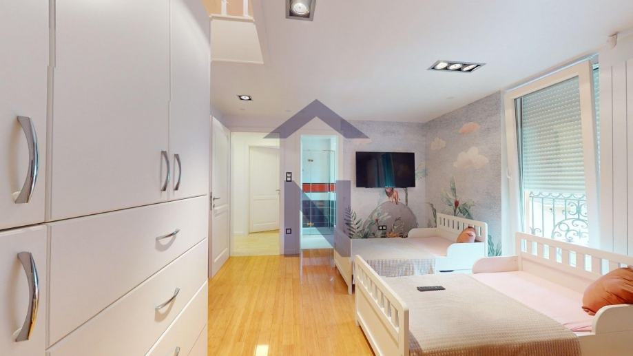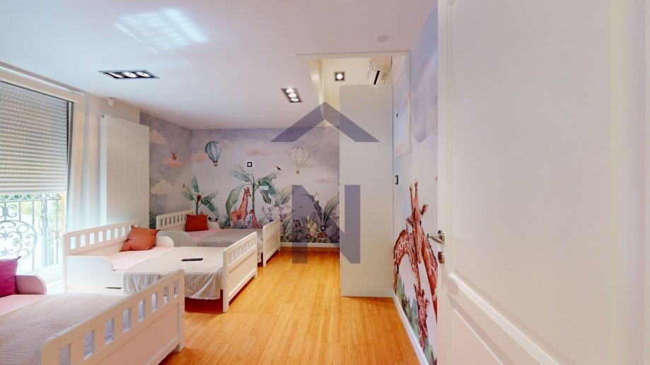 1. Kat: glavna spavaća soba s kupaonicom, garderobom, terasom i pripadajućom galerijom, tri dječje spavaće sobe, svaka s vlastitom kupaonicom i pripadajućom galerijom.