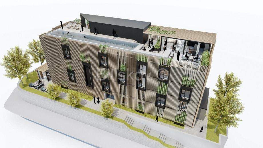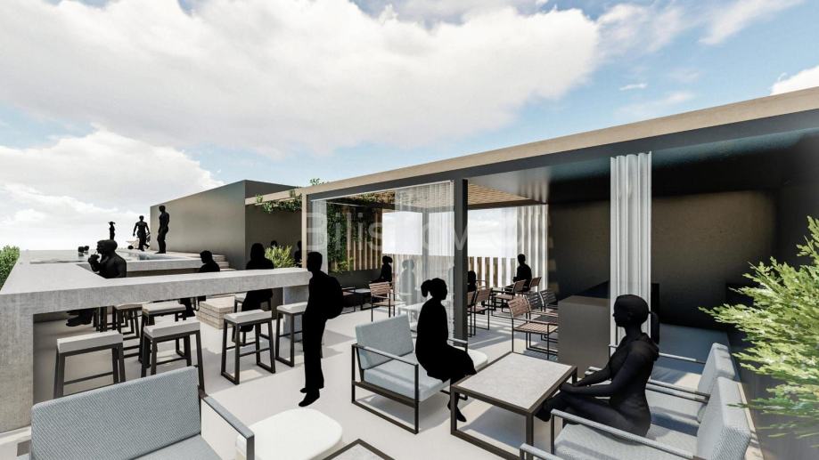 Dogradnja na krovnoj terasi predviđena je uglavnom kao čelična konstrukcija obložena profiliranim limom, s unutarnjom oblogom od gipskartonskih ploča. Zatvoreni dio dogradnje uključuje servisne prostore terase i bazena, dok se na dijelu terase planira nadstrešnica i pergola za zaštitu od sunca. Na etaži krova planira se bazen dimenzija 2,7 x 20 m i dubine 1,2 m. Uz bazen će se nalaziti povišeni dio sunčališta na čeličnoj potkonstrukciji, prekriven drvenim „deckingom“ ispod kojeg je smješten kompenzacijski i neutralizacijski bazen za pročišćavanje vode. Oko krovne terase i bazena postavit će se zaštitna, djelomično ostakljena ograda visine između 1,2 i 1,4 m.