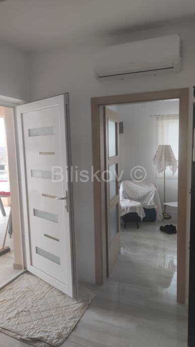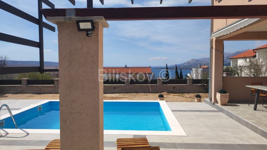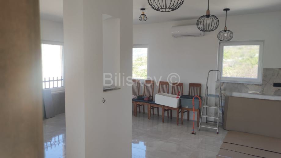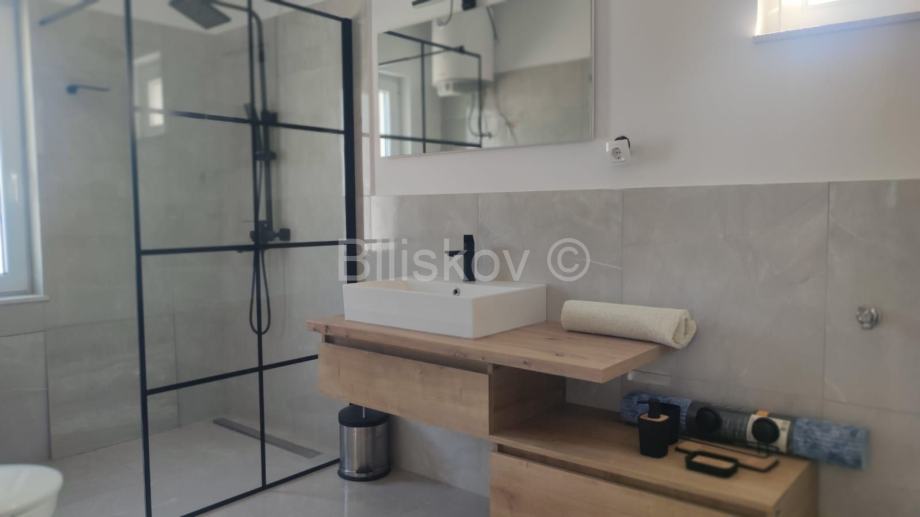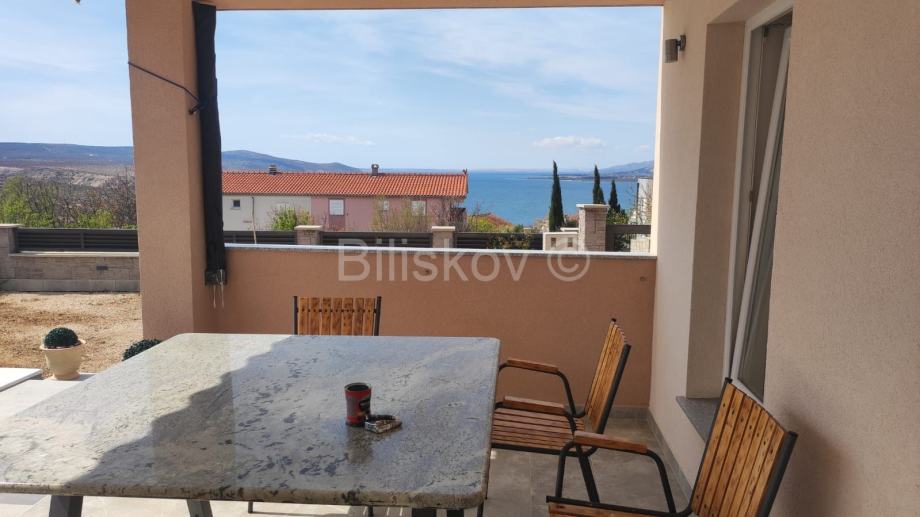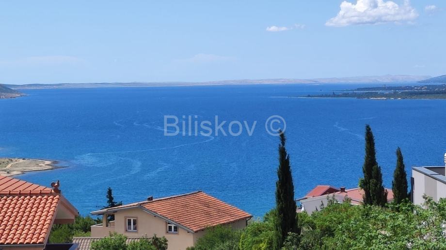 Apartman na katu (77m2): zaseban ulazni prostor, spavaća soba, open space prostor gdje se nalazi dnevni boravak, kuhinja i blagovaonica s prekrasnim pogledom na more i Velebit, kupaonica i natkrivena terasa.