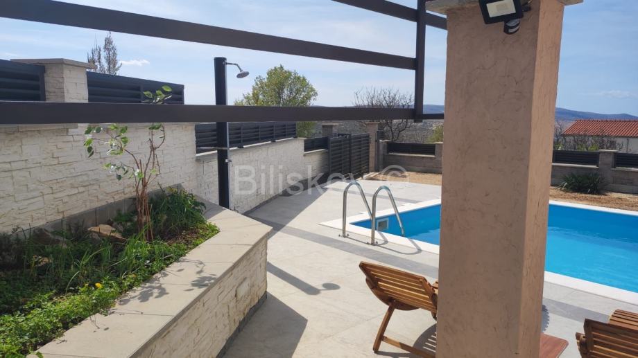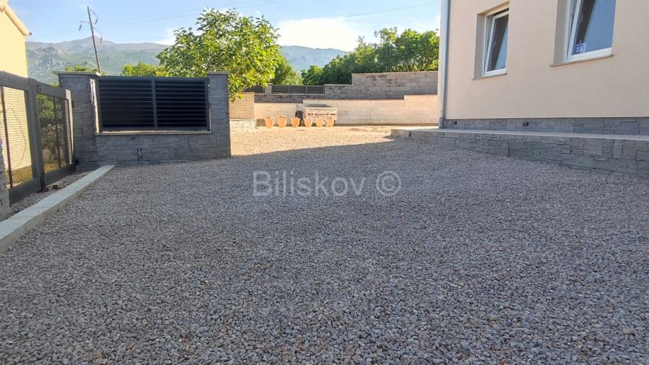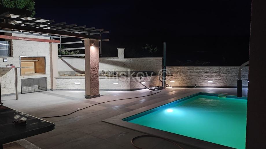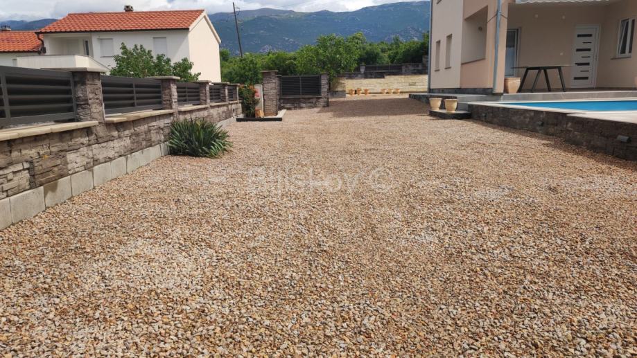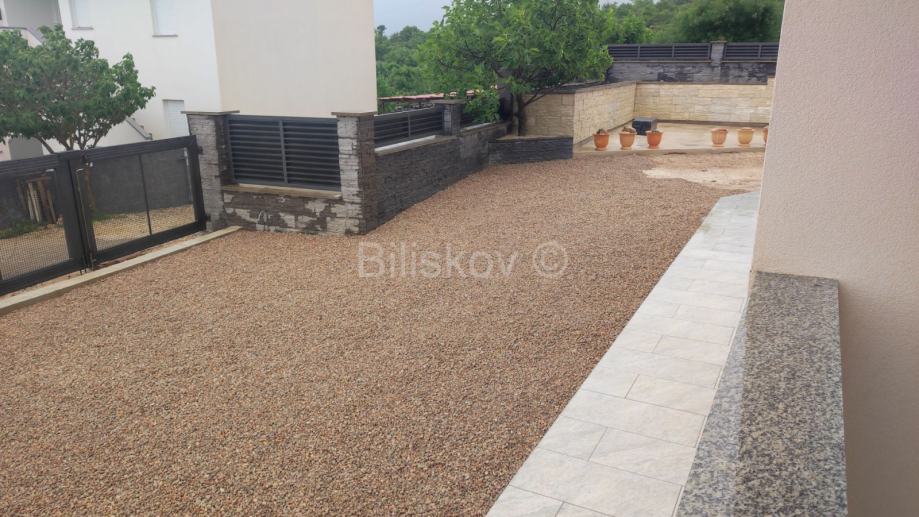 Apartmanu u prizemlju pripada prostrana terasa uz bazen, bazen 5x5 sa podzemnom tehničkom stanicom te tri parkirna mjesta.