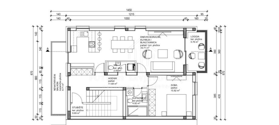 Ovu etažu dodatno obogaćuju loggia površine 5,76 m² i nenatkriveni balkon površine 8,71 m², koji prostoru daju dodatnu prozračnost i prirodno svjetlo te omogućuju boravak na otvorenom.
