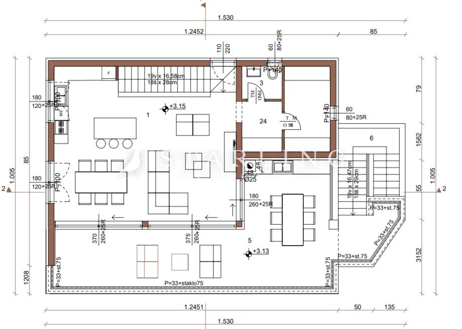 Prodajemo prekrasnu vilu s očaravajućim pogledom na more. Ova raskošna nekretnina sastoji se od prizemlja i kata, pažljivo dizajnirana za maksimalnu udobnost i luksuz. Prizemlje nudi prostrani dnevni boravak koji se otvara prema elegantnoj terasi i velikom bazenu, idealnom za opuštanje i zabavu. Na katu se nalaze tri prostrane spavaće sobe, svaka s vlastitom luksuznom kupaonicom, pružajući maksimalnu privatnost i udobnost.