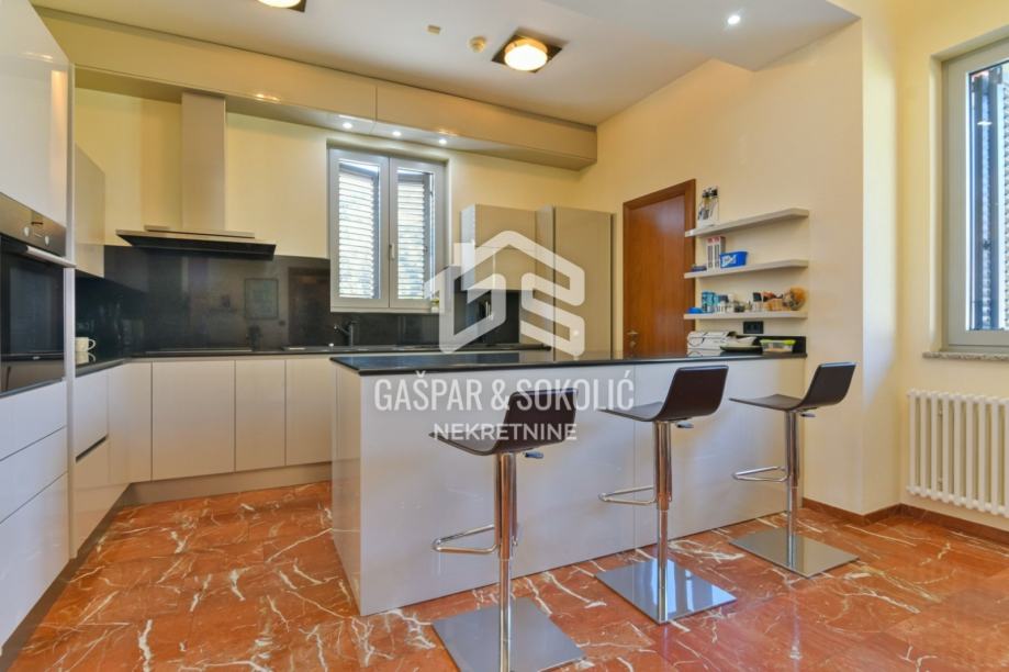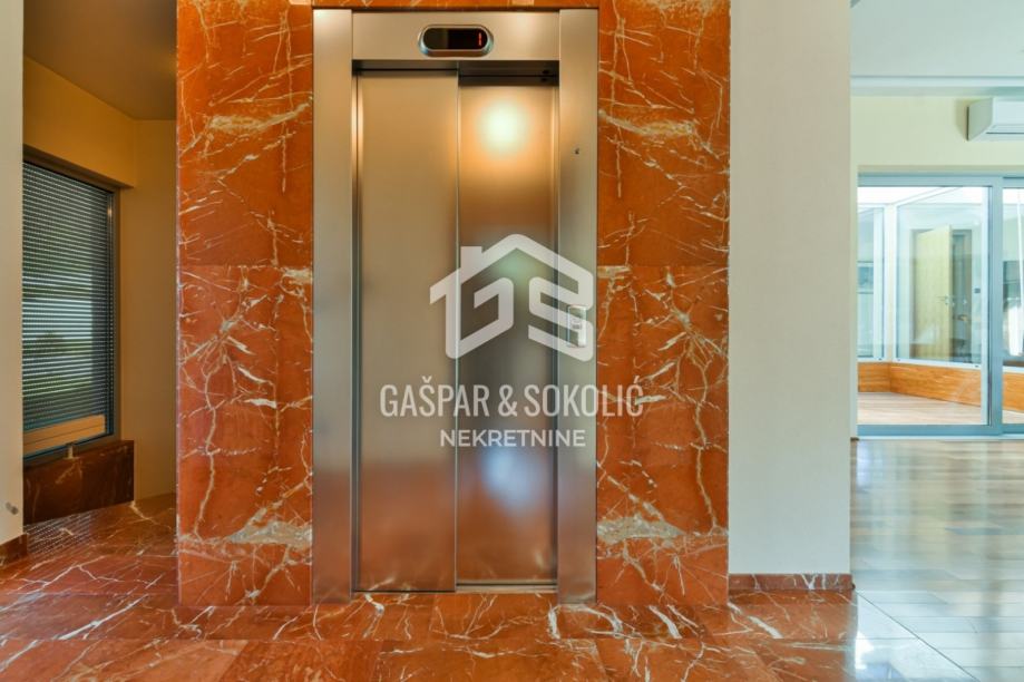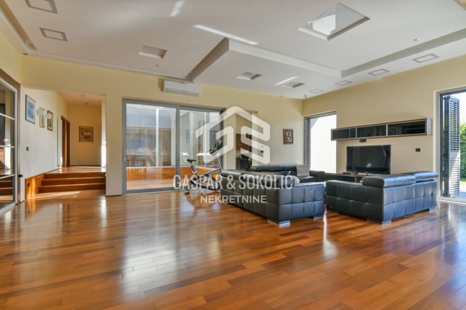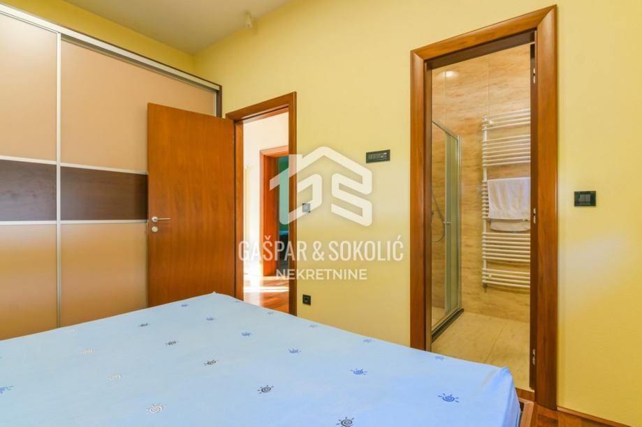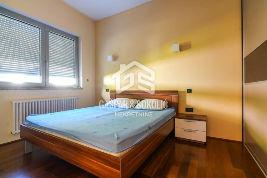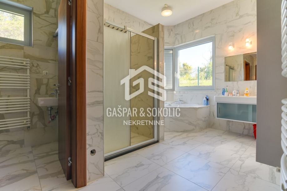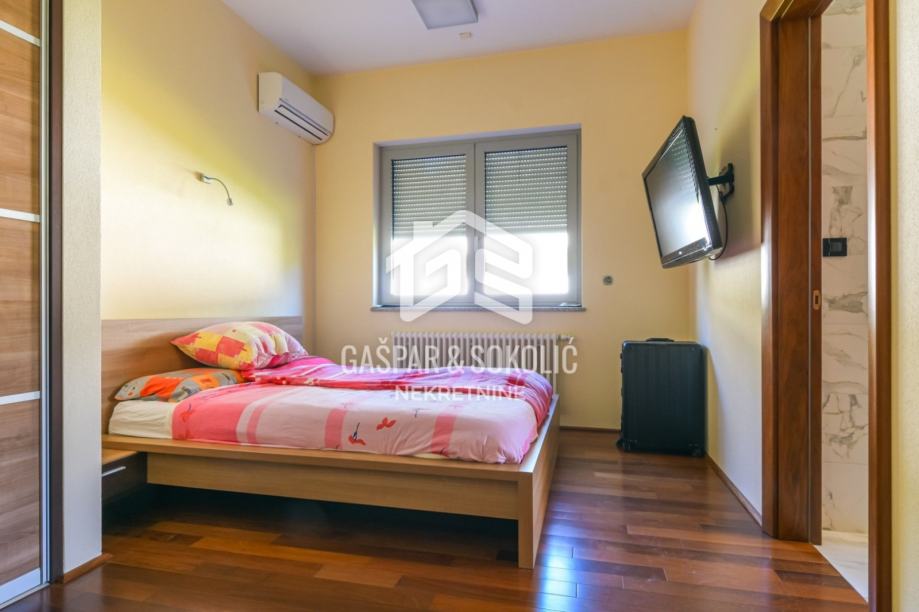 Na istoj etaži u drugom dijelu kuće nalazi se pet soba, od kojih tri imaju vlastite kupaonice, dok dvije sobe dijele jednu prostranu kupaonicu. Spavaći i dnevni dio kuće su odvojeni atrijem i jednom prolaznom sobom koja može poslužiti kao radni kutak ili dodatni prostor za smještaj.