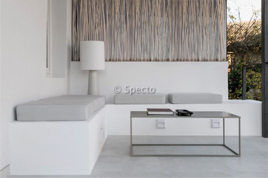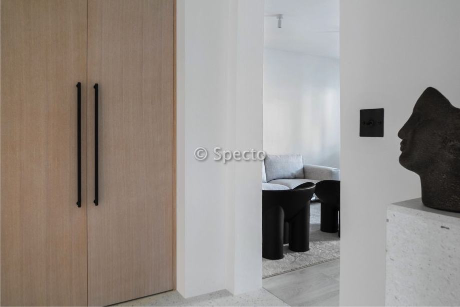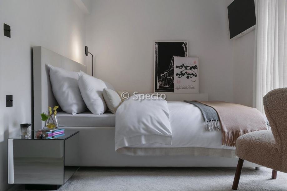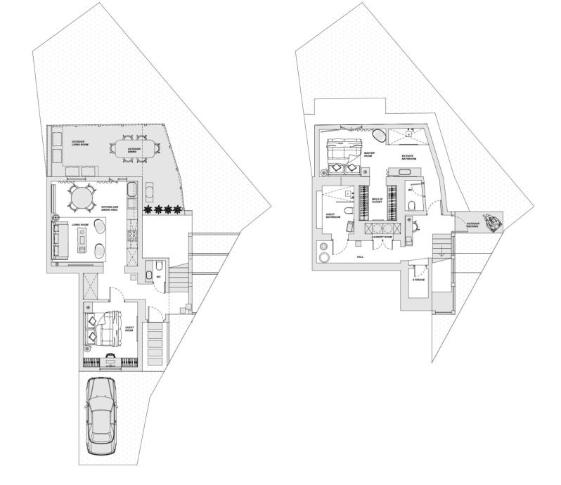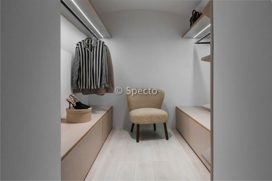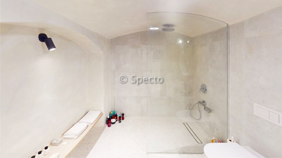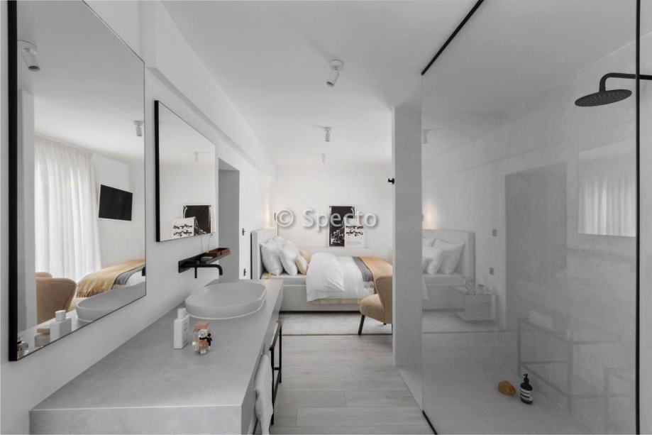 Donja etaža se sastoji od: master spavaće sobe s otvorenom kupaonicom, zasebnim wc-om i garderobom te izlazom u vrt, još jedne kupaonice s wc-om, malog vešeraja i spemišta