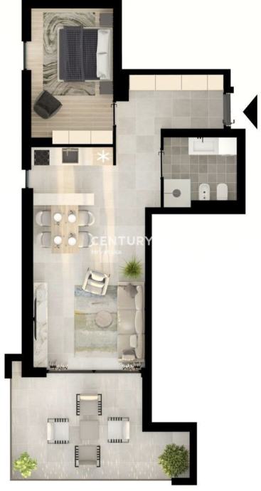 Sastoji se od ulaznog hodnika, dnevnog boravka sa kuhinjom i blagovaonicom otvorenog tipa, jedne spavaće sobe, i kupaonice.