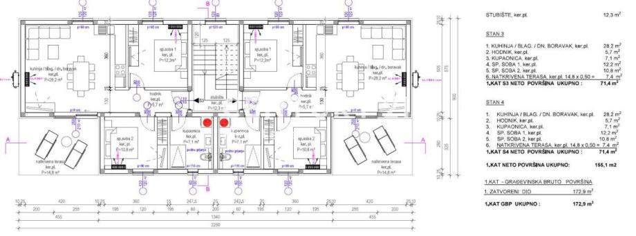 ZAŘÍZENÍ: - celá budova je zateplena 10 cm polystyrenem, - vstup do budovy jsou hliníkové antracitové dveře s elektrickým zámkem a videovrátníkem, - vstup do objektu a schodiště jsou dlážděné keramickou dlažbou (třída I), u schodiště je nerezový plot, - chodby - schodiště pro vstup do bytů je vybaveno protipožárním zařízením a zařízeními pro bezpečnost nájemníků před požárem, - vchodové dveře do bytů jsou proti vloupání a protipožární, - obývací pokoj a pokoje mají internet a satelitní televizi, - podlahy v kuchyni, obývacím pokoji a terase jsou položeny keramickou dlažbou (třída I), v ložnicích jsou podlahové krytiny SPC, - truhlářství je z vnější strany antracitové PVC a zevnitř bílé, s tříkomorovým sklem, - žaluzie na všech oknech a posuvných stěnách jsou elektrické, - všechna okna a posuvné stěny mají zabudované sítě proti hmyzu, - prostory jsou vytápěny a chlazeny klimatizacemi Vaillant, v koupelnách je instalováno elektrické podlahové vytápění, - koupelny vybavené prvotřídními obklady, moderním nábytkem, dvojumyvadlo, závěsné WC mísy, vestavěná splachovací nádržka, prosklená průchozí stěna - ve všech místnostech je LED osvětlení, - polovina balkonů má zděné ploty, zatímco druhá polovina je skleněná, - byty se prodávají bez nábytku, zařízeny budou pouze koupelny Více informací a prohlídka: +385 99 701 6618 marin.roncevic@c21.hr