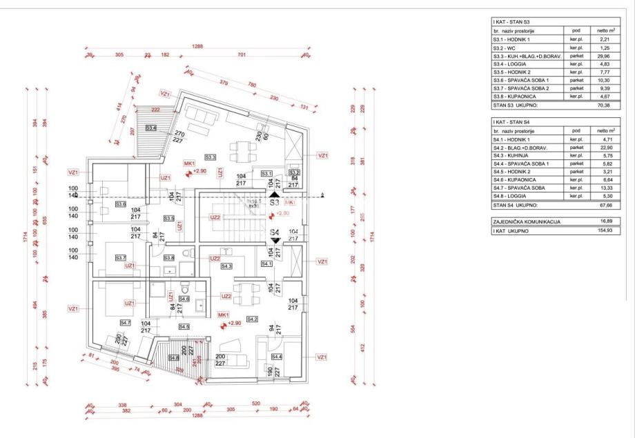 Ukupna netto korisna površina stana iznosi 70.38 m2.