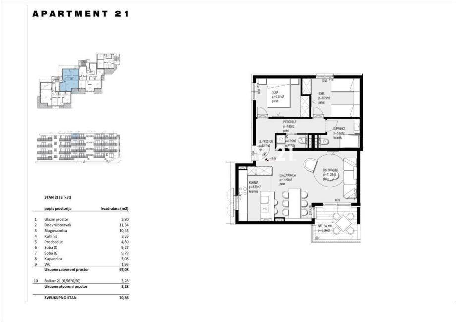 Stan 20 nalazi se na trećem katu zgrade, interijer je površine 95,52m2, a ima i balkon s pogledom na more površine 22,63m2.