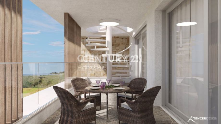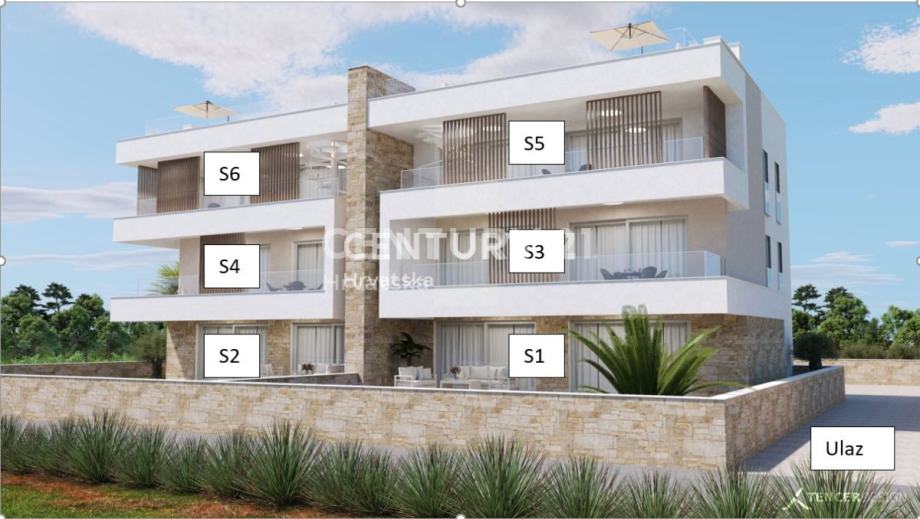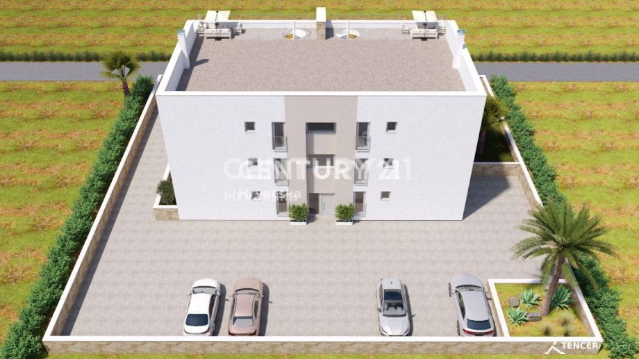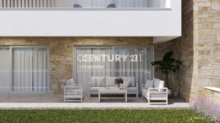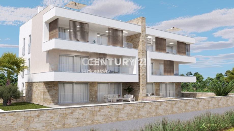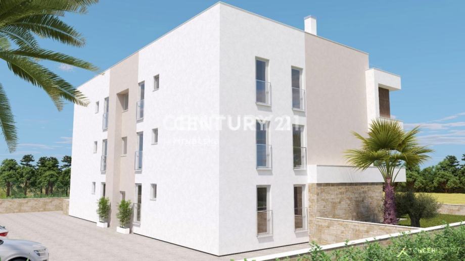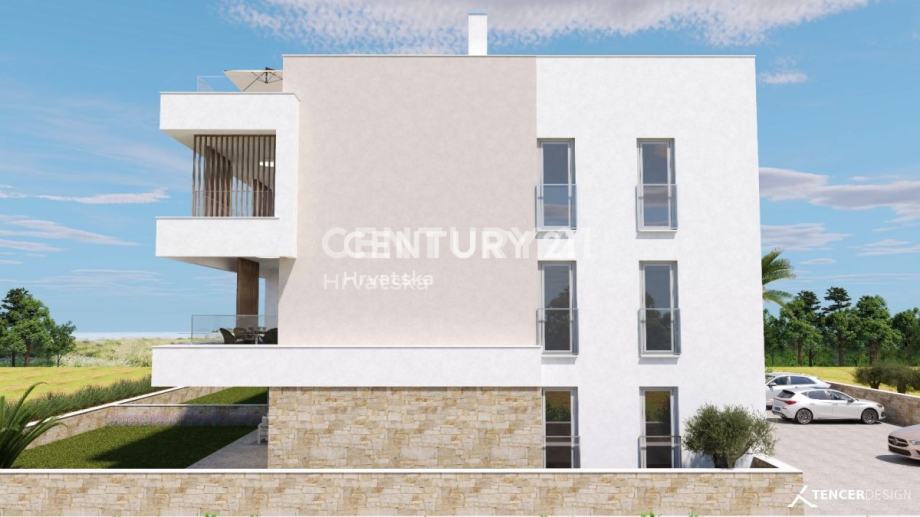 Prodaje predivan stan u izgradnji, udaljen samo 85 metara od mora. Stan se nalazi u prizemlju i ima vlastiti vrt. Iz stana se pruža predivan pogled na more.