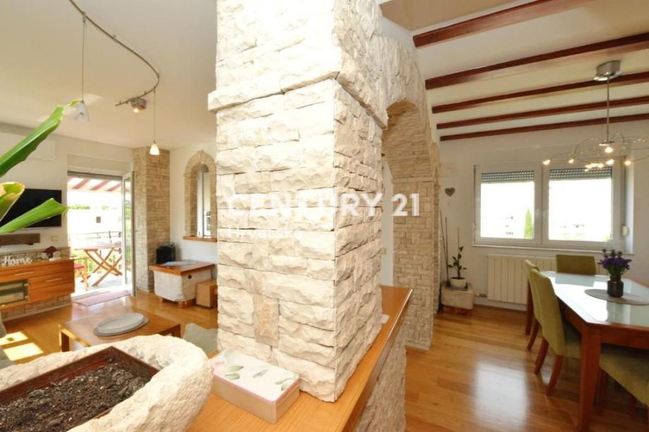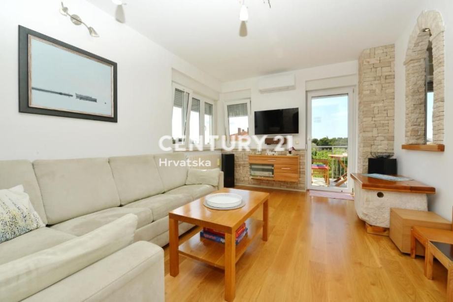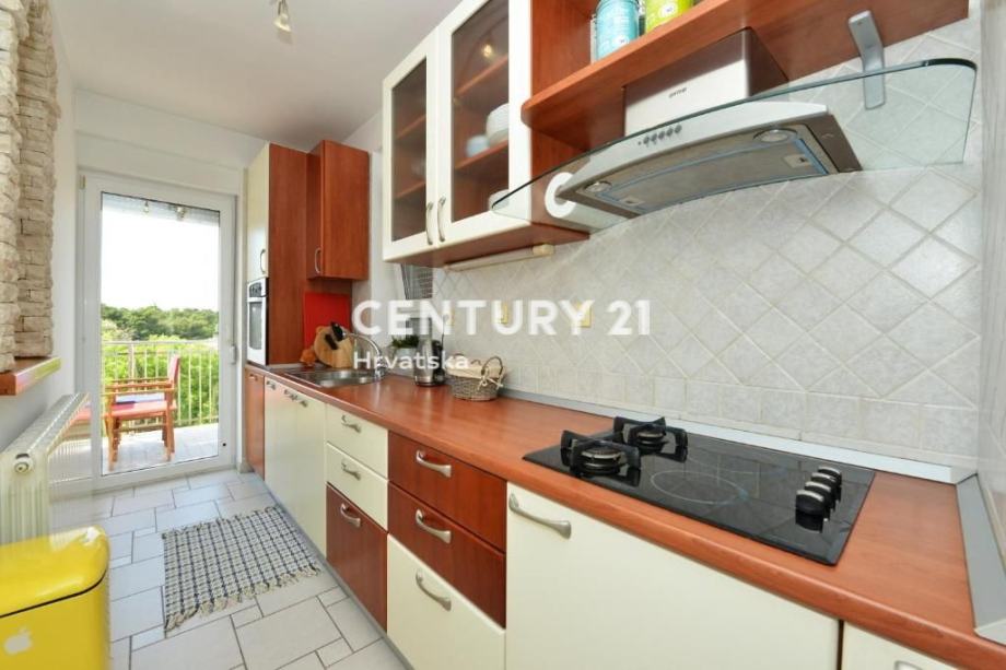 Ulazni prostor, dnevni boravak s blagovaonicom, kuhinja (dio za pripremu hrane je odvojen i ima prozor te izlaz na balkon), kupaonica s WC-om, dvije spavaće sobe i balkon. (zapadne orijentacije s pogledom na Poluotok- a na koji se izlazi iz dnevnog boravka).
