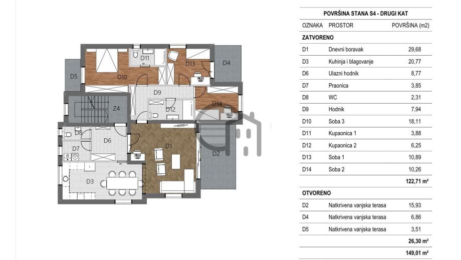 U šibenskom naselju Vidici, na mirnoj i poželjnoj lokaciji, smjestio se izuzetno komforan penthouse koji predstavlja savršen spoj modernog dizajna, funkcionalnosti i luksuza. Ovaj stan zauzima cijeli drugi kat manje zgrade novije gradnje, s ukupno samo pet stambenih jedinica, što budućim vlasnicima jamči visoku razinu privatnosti i miran životni ambijent.Ukupne neto korisne površine od 149,01 m², penthouse je pažljivo projektiran kako bi pružio maksimalnu udobnost i iskoristivost prostora. Otvoren koncept dnevnog boravka s kuhinjom i blagovaonicom (50,45 m²) stvara prostran i svijetao središnji dio stana, idealan za svakodnevni život i druženje. Tri spavaće sobe, od kojih je najveća 18,11 m², dvije kupaonice, dodatni WC, praonica te prostrani hodnik, osiguravaju funkcionalan raspored pogodan za obitelj ili veće zahtjeve stanara.Posebnu vrijednost daju tri natkrivene terase (ukupno preko 26 m²), koje nude dodatni prostor za opuštanje, objedovanje na otvorenom ili uživanje u pogledu i suncu.Stan dolazi s dva vlastita parkirna mjesta, a cijela zgrada građena je prema visokim standardima – uključujući podno grijanje u svim prostorijama, klima uređaje, energetski učinkovitu opremu te korištenje vrhunskih materijala i završne obrade.Lokacija u Vidicima nudi odličnu povezanost s centrom grada, kao i neposrednu blizinu svih važnih sadržaja – škole, vrtića, trgovina i javnog prijevoza – čineći ovaj penthouse idealnim izborom za svakodnevni život, ali i kao vrijednu nekretninu za dugoročnu investiciju.Ukoliko tražite nekretninu koja nudi kvalitetu, prostor, mir i suvremeni stil života, ovaj penthouse zasigurno će ispuniti vaša očekivanja.