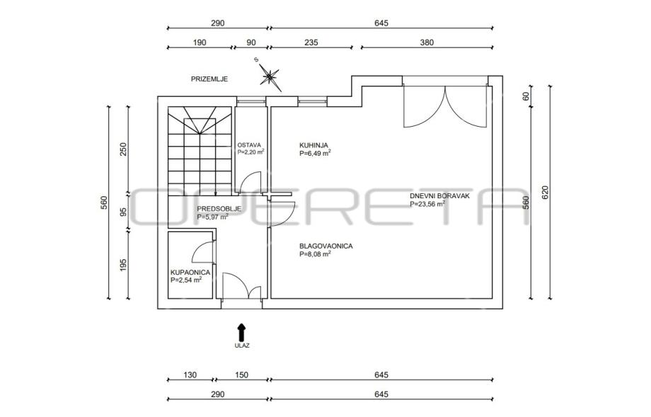 Prizemlje: ulaz, gostinski wc, veliki open space boravak / kuhinja, izlaz na terasu / vrt površine 30 m2.