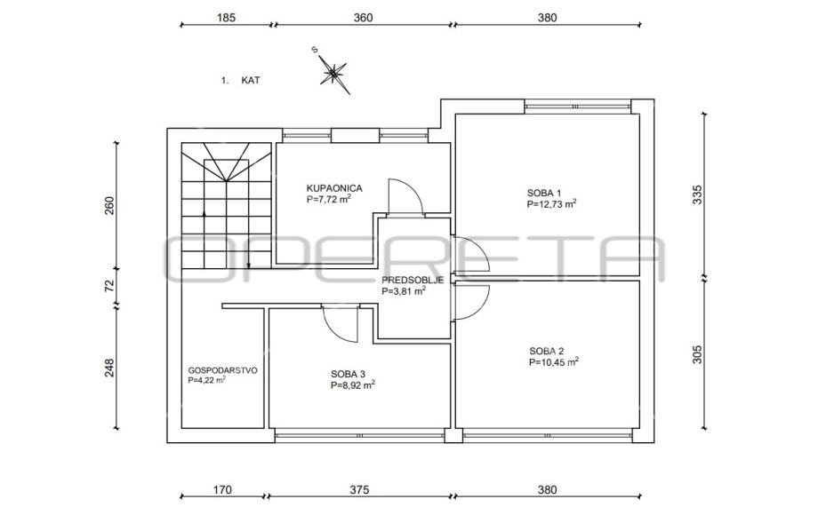 Prvi kat: hodnik, 3 spavaće sobe, kupaonica sa kadom i tušem, praonica sa perilicom i sušilicom.