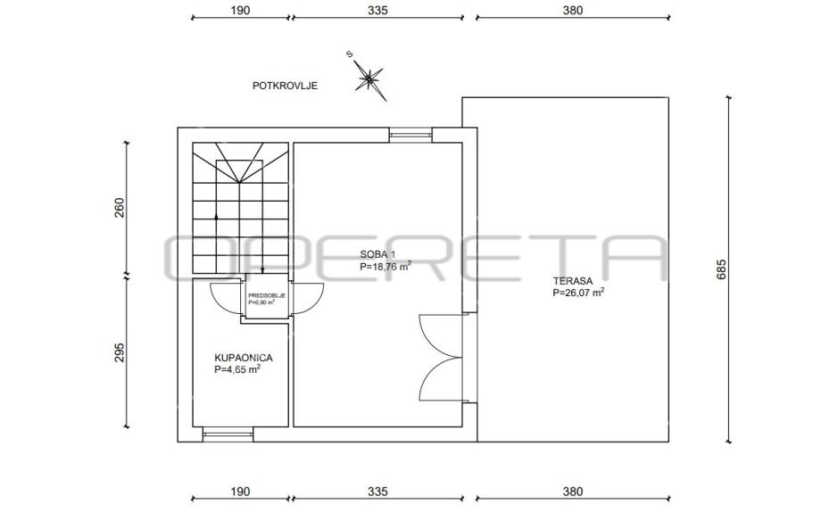 Drugi kat: hodnik sa ugradbenim ormarom, kupaonica sa kadom, velika roditeljska spavaća soba, zatvorena loggia površine 30 m2.