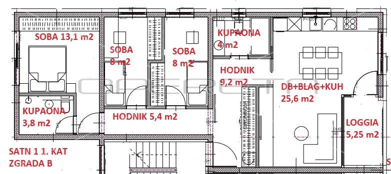 Primamo rezervacije za stan u novogradnji. Manja zgrada sa samo 4 stana. Stan se sastoji od " open space" dnevnog boravka, blagovaonice i kuhinje s izlazom na loggiu, dvije sobe i kupaonice s wc-om. Istočne je i zapadne orijentacije. U cijeni je garaža, vanjsko parkirno mjesto i spremište od 7,5m2. Odlična lokacija na par minuta pješaćke udaljenosti od osnovne škole, trgovine i autobusne stanice, kao i do svih ostali sadržaja važnih za ugodan život.