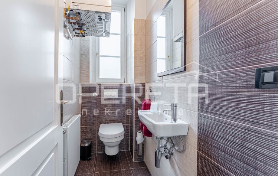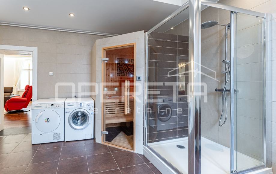 Luksuzna kupaonica (18.5 m²): Podno grijanje, prvoklasna keramika i oprema Villeroy & Boch. Sadrži saunu, masažnu kadu (jacuzzi) i tuš kabinu. U stanu se nalazi i odvojeni manji WC.