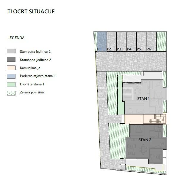 Ukupno je osigurano 6 parkirnih mjesta. Uz svaki stan obavezna je kupnja minimalno 1 parkirnog mjesta, uz mogućnost dodatnog.