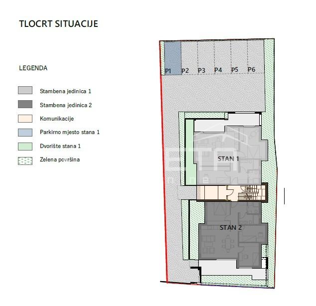 Ukupno je osigurano 6 parkirnih mjesta. Uz svaki stan obavezna je kupnja minimalno 1 parkirnog mjesta, uz mogućnost dodatnog.