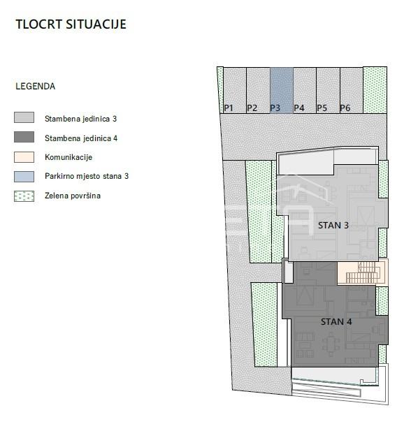 Ukupno je osigurano 6 parkirnih mjesta. Uz svaki stan obavezna je kupnja minimalno 1 parkirnog mjesta, uz mogućnost dodatnog.