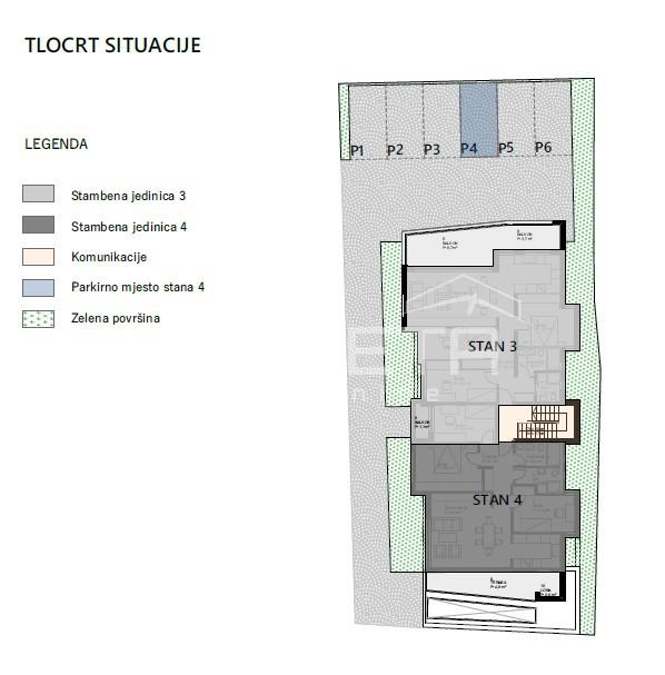Ukupno je osigurano 6 parkirnih mjesta. Uz svaki stan obavezna je kupnja minimalno 1 parkirnog mjesta, uz mogućnost dodatnog.