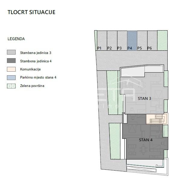 Ukupno je osigurano 6 parkirnih mjesta. Uz svaki stan obavezna je kupnja minimalno 1 parkirnog mjesta, uz mogućnost dodatnog.
