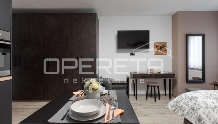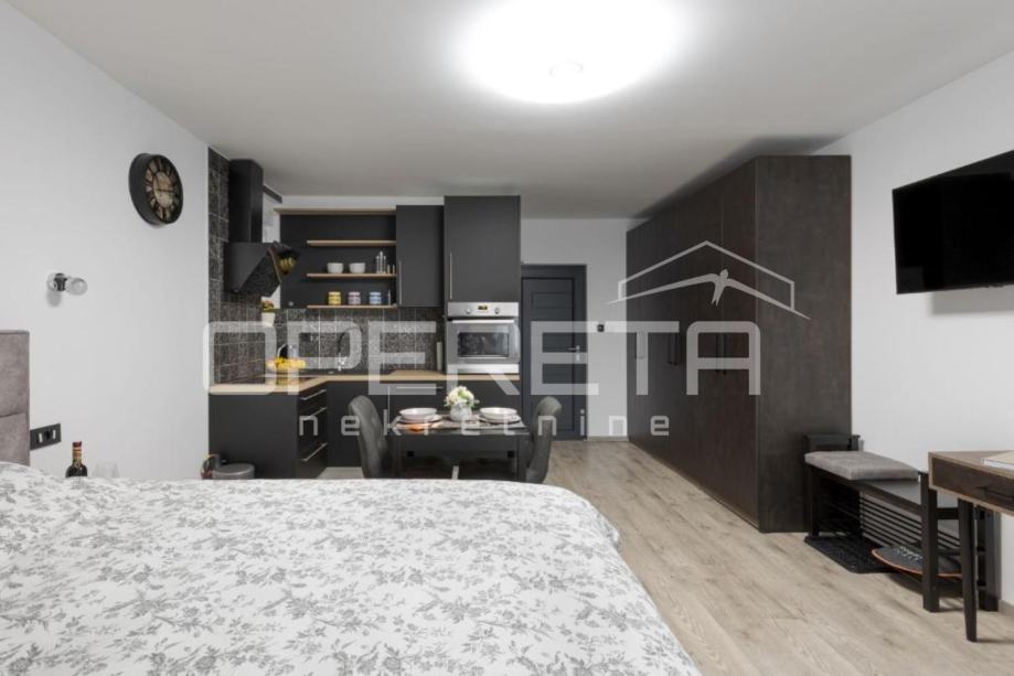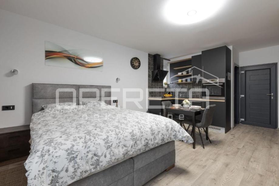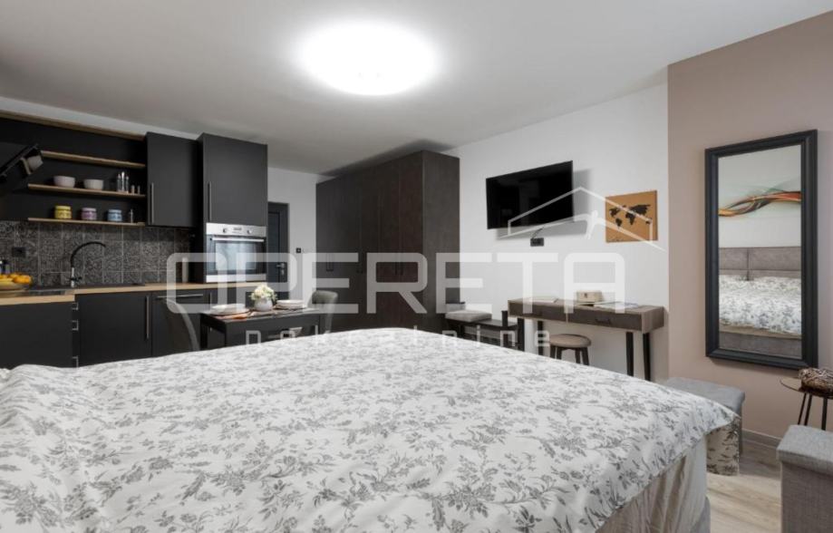 - garsonijera od 33 m² odiše toplinom i modernim uređenjem, sastoji se od potpuno opremljene kuhinje s blagovaonicom, prostranog dijela za spavanje s bračnim krevetom te elegantne kupaonice.
