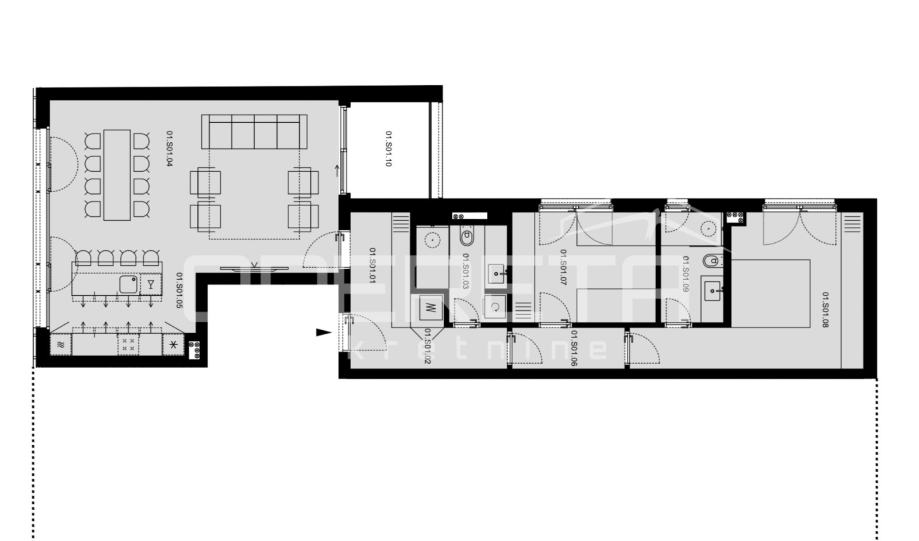 S01 - trosoban stan na prvom katu, zatvorene površine 97,12m2, sa loggiom 5,41m2 (4,06). Ukupno NKP 101,18m2.