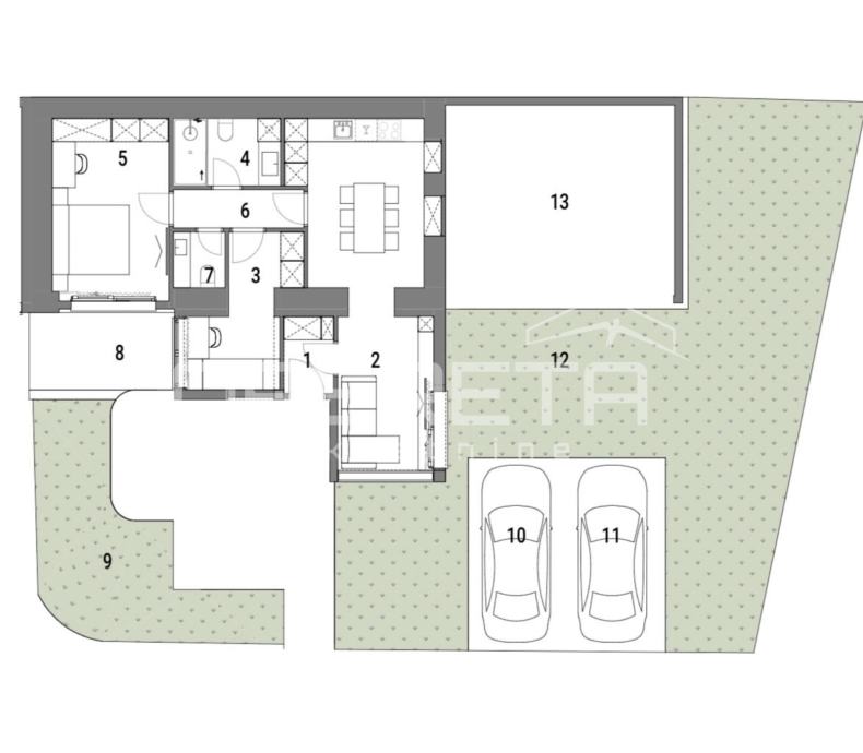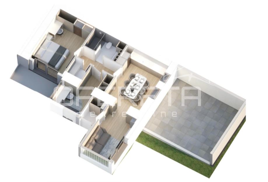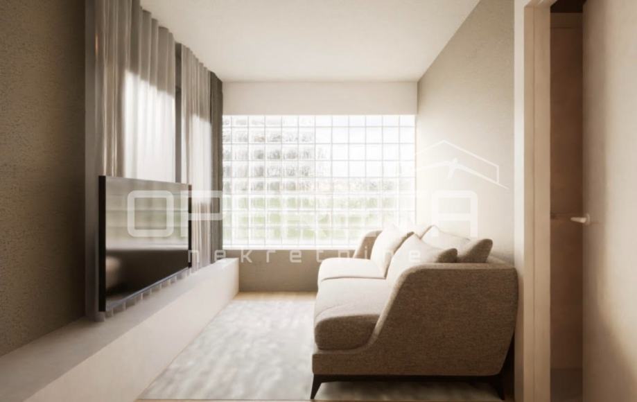 Sastoji se od ulaznog prostora, open space dnevnog boravka s blagovaonicom površine 29 m2, spavaće sobe 18 m2, kuhinje, kupaonice i gostinjskog toaleta. Vanjska površina: natkrivena terase 20 m2 (10 m2), nenatkrivena terasa 20 m2 (5 m2) te vrt površine 92,68 m2 (9,27 m2).