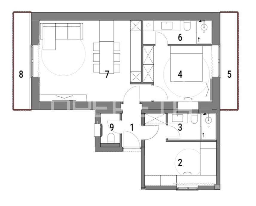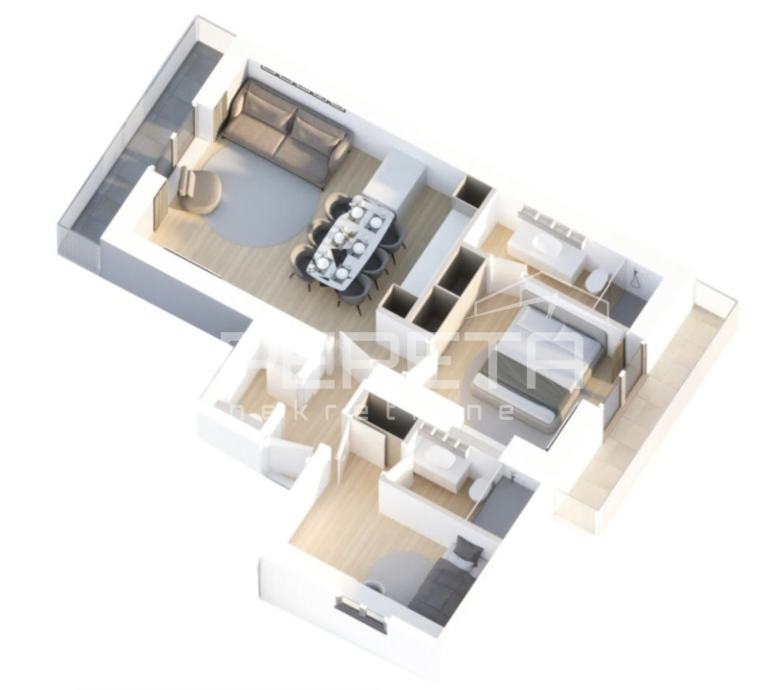 Sastoji se od ulaznog prostora, open space dnevnog boravka s kuhinjom blagovaonicom površine 28 m2, dvije spavaće sobe, dvije kupaonice, gostinjskog toaleta te dva balkona.