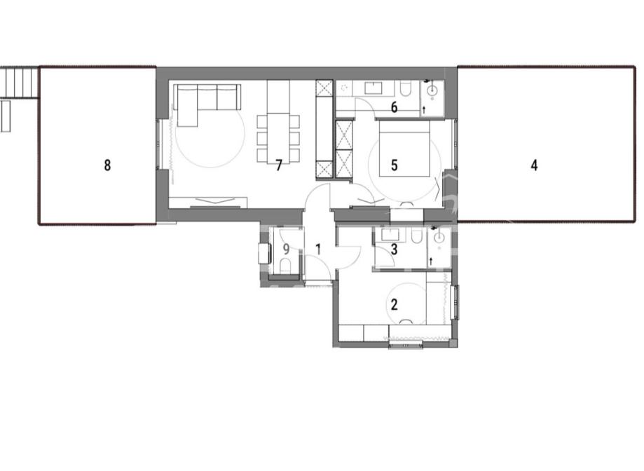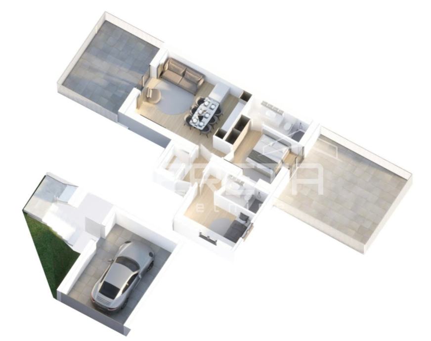 Sastoji se od ulaznog prostora, open space dnevnog boravka s kuhinjom blagovaonicom površine 28 m2, dvije spavaće sobe, dvije kupaonice i gostinjskog toaleta. Vanjska površina: nenatkrivena terasa 21,97 m2 (5,49 m2), nenatkrivena terasa 33,67 m2 (8,42 m2).