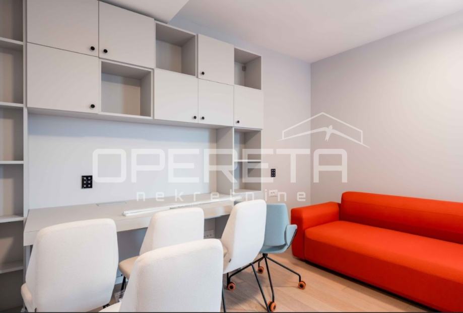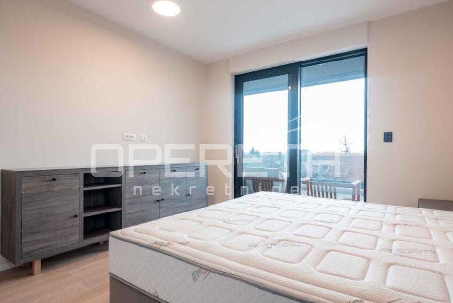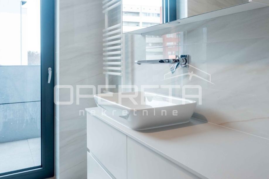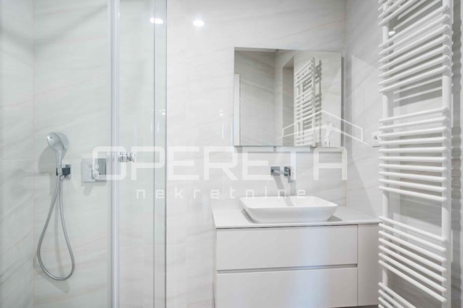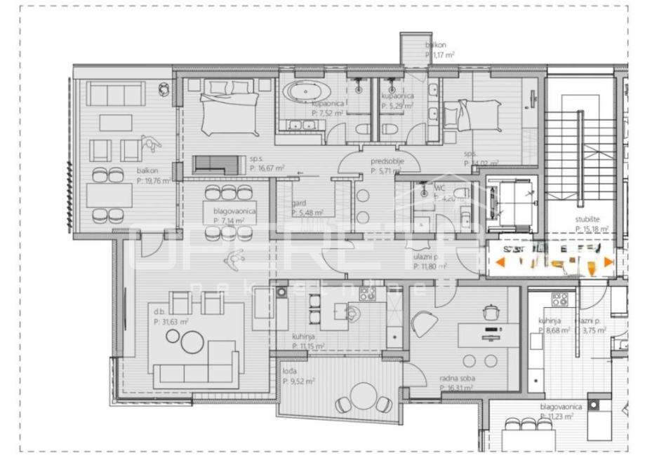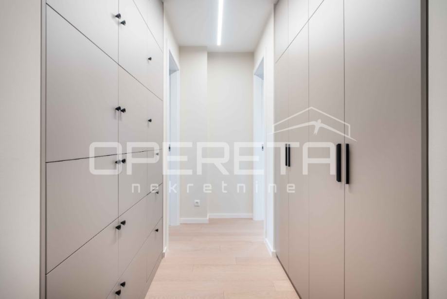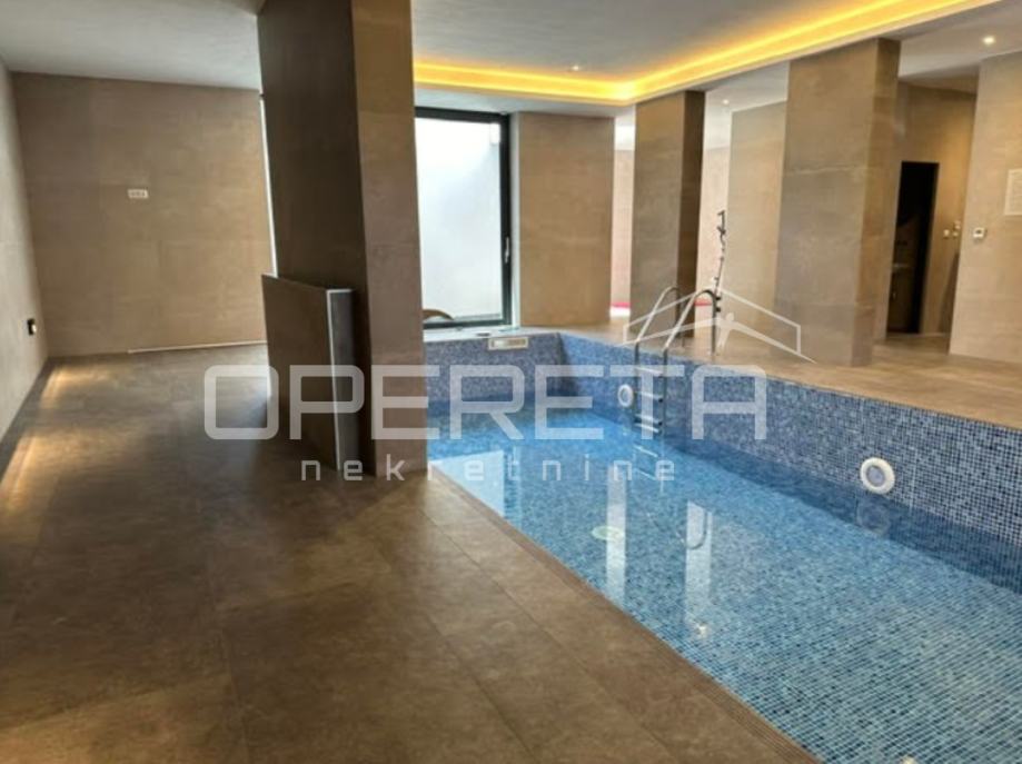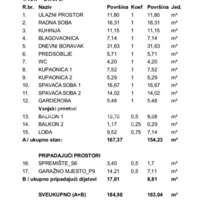 Luksuzni potpuno namješten novi stan s bazenom, na drugom katu u centru Varaždina, u ukupnoj veličini od 175, 92 m2. Površinski se sastoji od: ulaznog prostora od 11.52 m2, predsoblja od 5.66 m2, wc-a od 4.26 m2, spavaće sobe od 14.18 m2, kupaonice od 5.62 m2, kupaonice od 7,27 m2, natkrivenog balkona 1. od 0.78 m2, spavaće sobe i garderobe od 24.08 m2, natkrivenog balkona 2. od 9.93 m2, otvorenog prostora kuhinje, blagovaonice i dnevnog boravka od 50.89 m2, radne sobe od 16.45 m2, loggie od 6.65 m2. Stanu pripadaju dva unutarnje garažna parkirna mjesta, svako od 7,21 m2, te spremište od 3,37 m2.