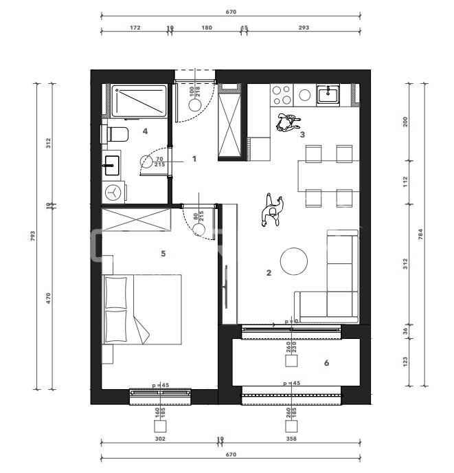 Sastoji se od ulaznog hodnika, kuhinje s blagovaonicom i dnevnog boravka, spavaće sobe, kupaonice i loggie. Uz stan je potrebno kupiti garažno mjesto i spremište.