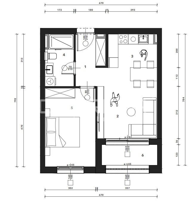 Sastoji se od ulaznog hodnika, kuhinje s blagovaonicom i dnevnog boravka, spavaće sobe, kupaonice i loggie. Uz stan je potrebno kupiti garažno mjesto i spremište.