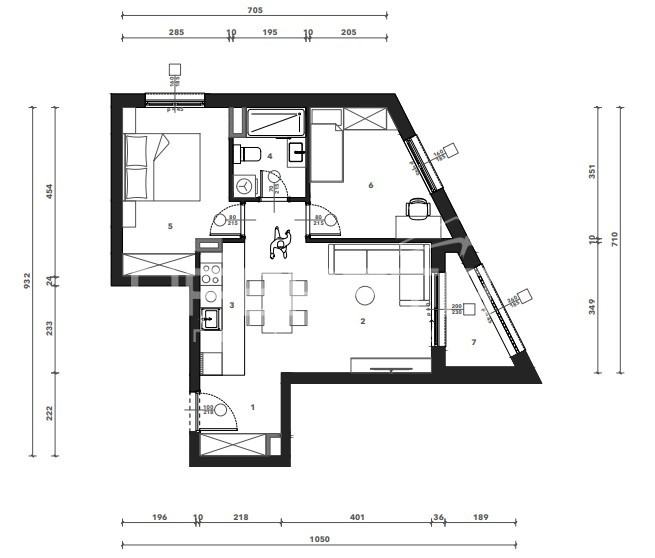 Sastoji se od ulaznog hodnika, kuhinje s blagovaonicom i dnevnog boravka, 2 spavaće sobe, kupaonice i loggie. Uz stan je potrebno kupiti garažno mjesto i spremište.