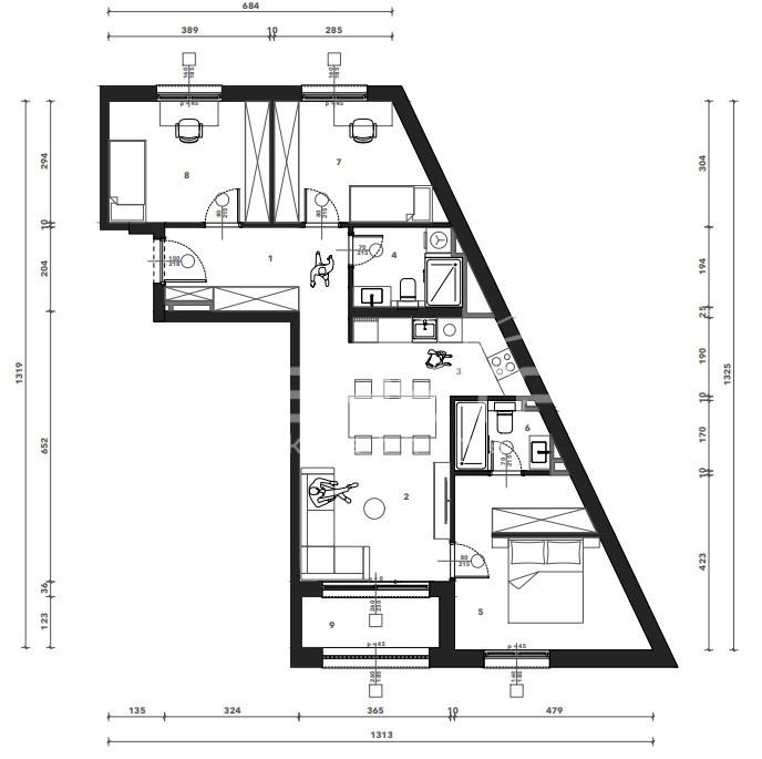 Sastoji se od ulaznog hodnika, kuhinje s blagovaonicom i dnevnog boravka, 3 spavaće sobe, 2 kupaonice i loggie. Uz stan je potrebno kupiti garažno mjesto i spremište.