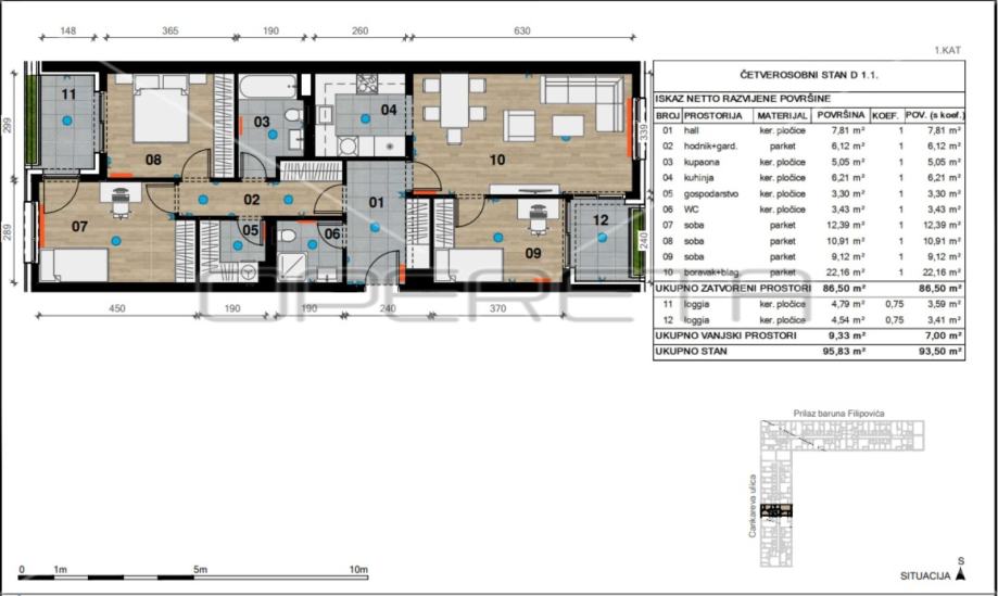 Prodaje se stan u izgradnji na prvom katu zgrade od ukupno sedam katova. Stan se sastoji od ulaza, dnevnog boravka i blagovaone, kuhinje, wc-a, kupaonice, tri spavaće sobe, ostave i dvije lođe površine 4,79m2 i 4,54m2. Mogućnost odabira pločica, parketa i sanitarije . Predviđeni završetak gradnje je proljeće 2024. godine. Kupac ne plaća porez na promet nekretnina. Obavezna kupnja garaže ili garažnog parkirnog mjesta, ovisno o raspoloživosti. Sustav pametne kuće, pametno upravljanje rasvjetom, roletama, te grijanjem i hlađenjem. Top lokacija!
