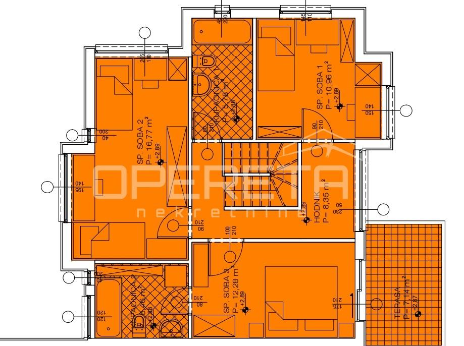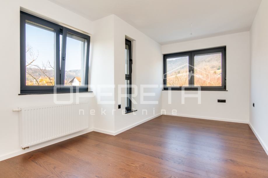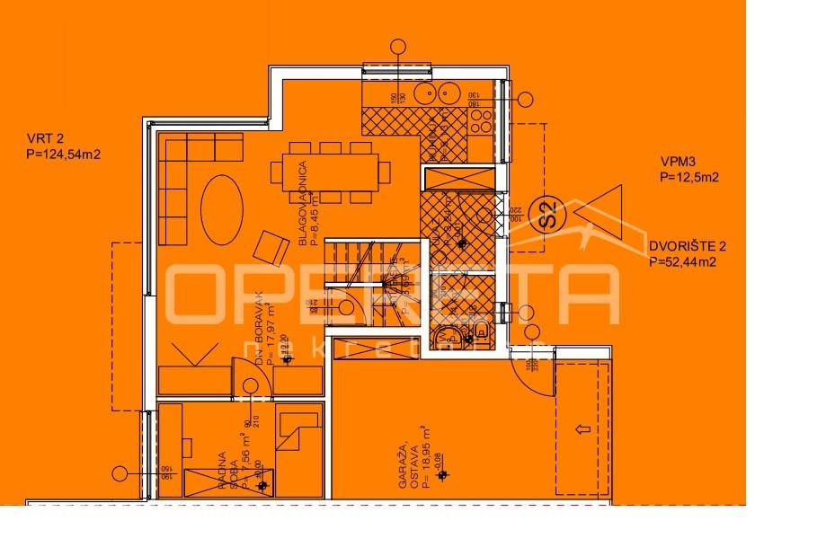 Stan se prostire na dvije etaže, ima 127m2 zatvorenog prostora; prizemlje - ulazni prostor, stubište, kuhinja s blagovaonicom i prostranim dnevnim boravkom koji ima izlaz na vrt 125m2, spavaća soba, gostinjski wc te garaža s ostavom 19m2, kat - hodnik, 2 spavaće sobe s kupaonicom, glavna spavaća soba sa vlastitom kupaonicom te izlaz na terasu 7m2.