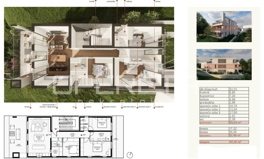 PRODAJA, NOVOGRADNJA, Maksimir, Gorice. Na vrhunskoj lokaciji uz šumu prodaje se projekt sa 3 stambene jedinice. Stan 2 (prizemlje) se sastoji od ulaznog hodnika, predosoblja, 3 spavaće sobe, vešeraja, kupaonice s wcom, posebnog wc-a, dnevnog boravka povezanog sa kuhinjom i blagavaonicom, te 2 terase (natkrivena i nenatkrivena) sveukupne bruto površine 151,16 m2. Uz stan u cijeni dolaze i 2 garažna parkirna mjesta od 25,25 m2 te spremište od 6,60m2 što sveukupno iznosi 183,02 m2 bruto. Koriste vrhunski materijali i oprema (dizalica topline podna grijanja-struja), pročišćivači vode, aluminij stolarija - 3 slojna stakla punjena argonom, priprema za električna vozila, te kupac po svojem izboru bira pločice, parkete i sanitarije. Završetak radova do 01.03.2026 godine! Za sva detaljnija pitanja kontaktirajte nas!
