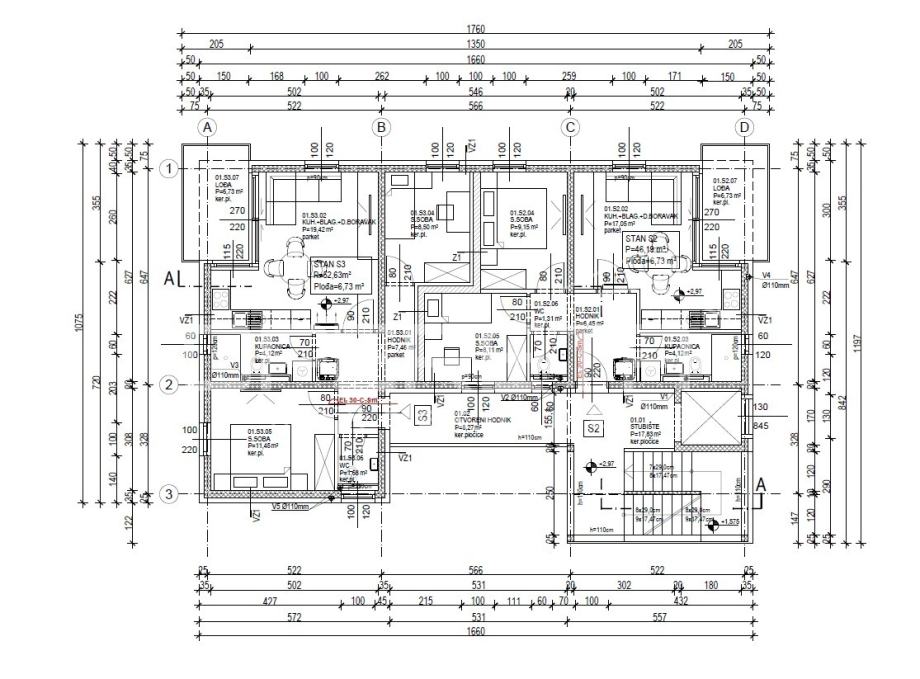 Prodaje se trosoban stan na 1. katu (zgrada A, S3) u luksuznoj novogradnji. Zgrada sadrži 4 stambene jedinice raspoređene na tri etaže. Cijeli projekt obuhvaća četiri zgrade s ukupno 16 stanova veličine od 47 m2 do 120 m2. Zgrade imaju lift. Okruženje šumom osigurava mir i privatnost. Planirani završetak gradnje je kraj 2026.