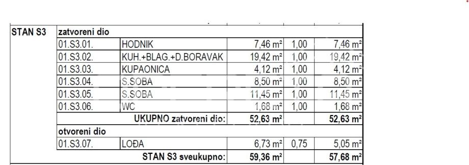 Stan S03 ima bruto površinu 74,52 m2 (59,36 m2 stan; 2,66 m2 spremište; 12,5 m2 vanjsko parkirno mjesto).