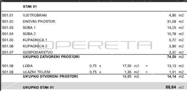 Zatvorena površina stana je 74,50 m2, a sastoji se od ulaznog prostora, open space dnevnog boravka s blagovaonicom i kuhinjom, dvije spavaće sobe, dvije kupaonice te gospodarstva. Stanu pripada i lođa neto površine 13,13 m2 i ulazni trijem neto površine 1,01 m2.