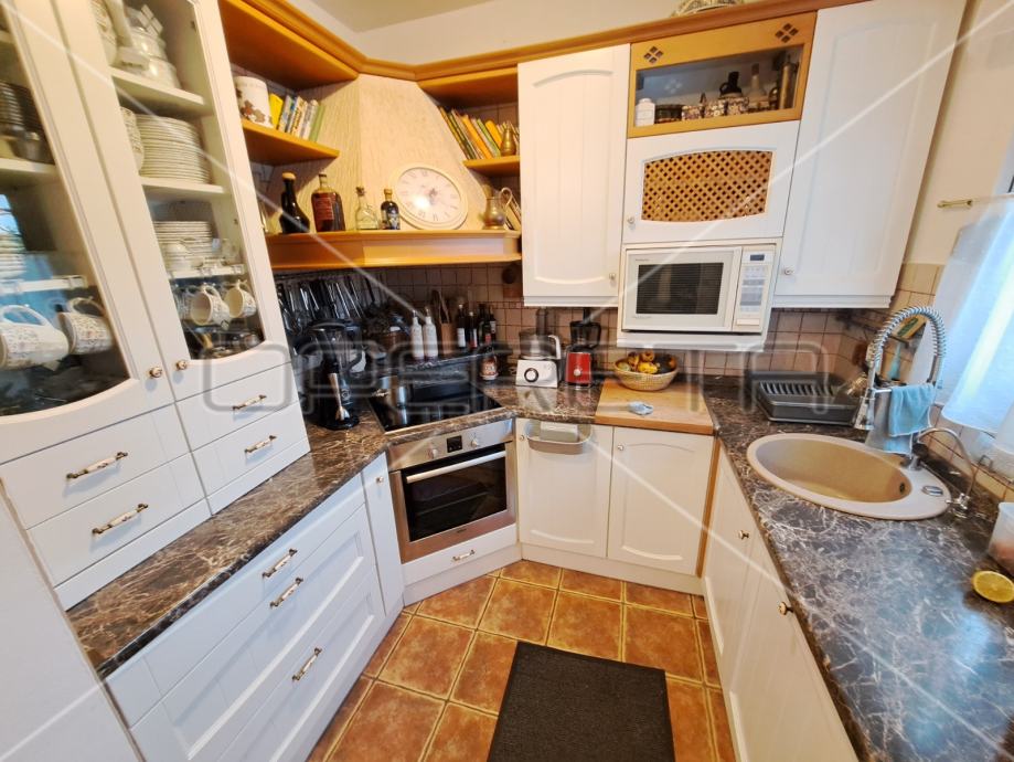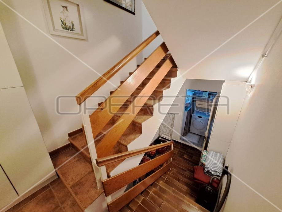 Stan se prostire ne dvije etaže od kojih se u prizemnoj nalazi ulaz i predprostor iz kojega se ulazi u kuhinju, pa u prostrani dnevni boravak koji ima izlaz na terasu od 14,24m2 i vrt od 53,19m2. Na terasi je roštilj i mjesto za druženje sa dozom privatnosti, a u vrtu je zasađeno i par voćaka. Stepenicama se sa prizemne etaže penje na 1. kat gdje se nalaze dvije spavače sobe i dvije kupaonice sa WC-om, te još jedna soba u potkrovlju koja je u funkciji spremišta i povezana je stepenicama sa etažom na 1. katu i vrlo lako se može prenamjeniti u sobu. Stan ima ukupno 108,43m2 stambene površine, a pripada mu i parkirno mjesto ispred ulaza od 19,52m2, te spremište u podrumu od 9,96m2.