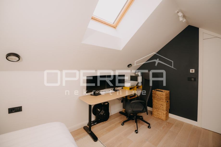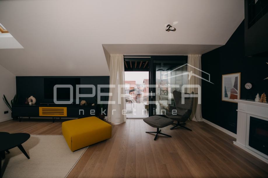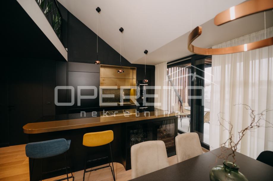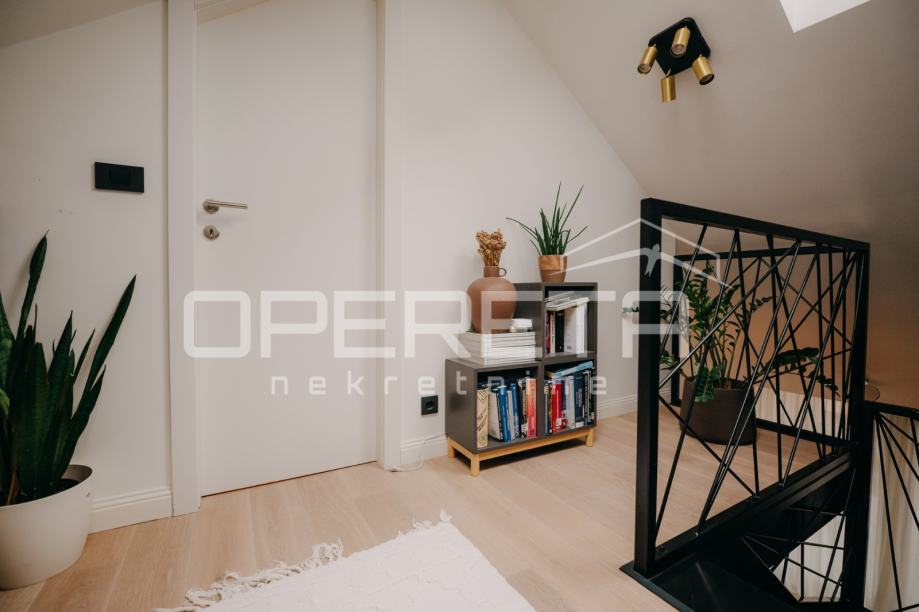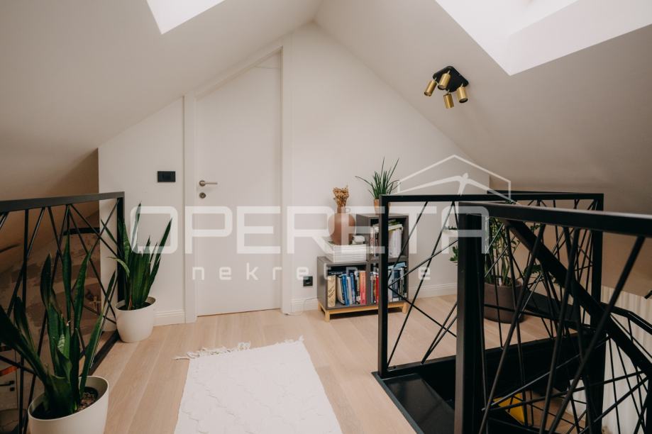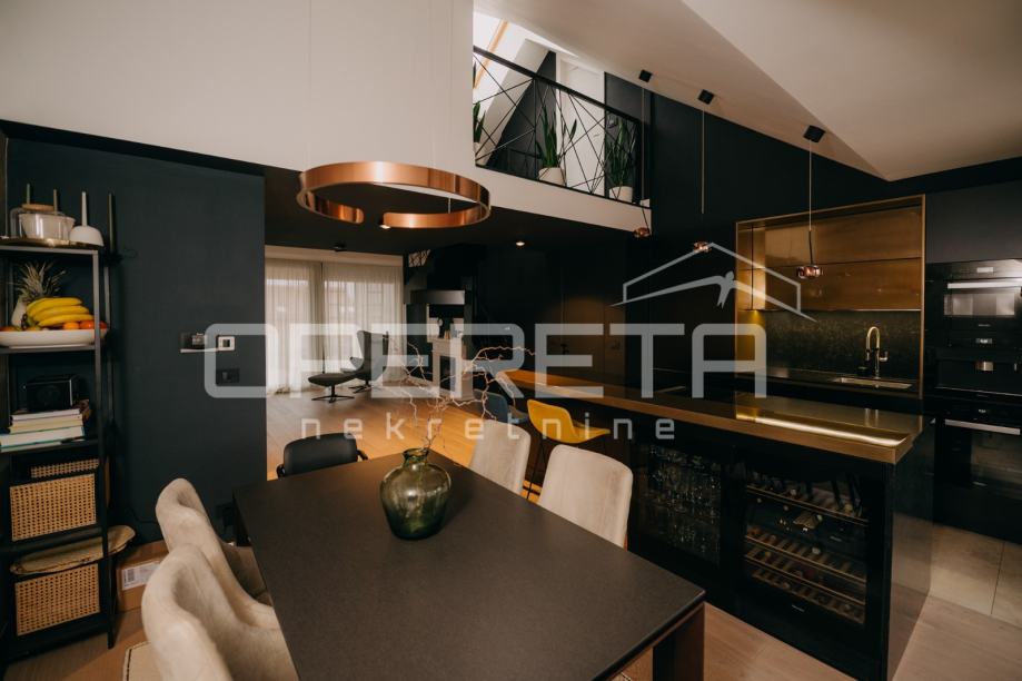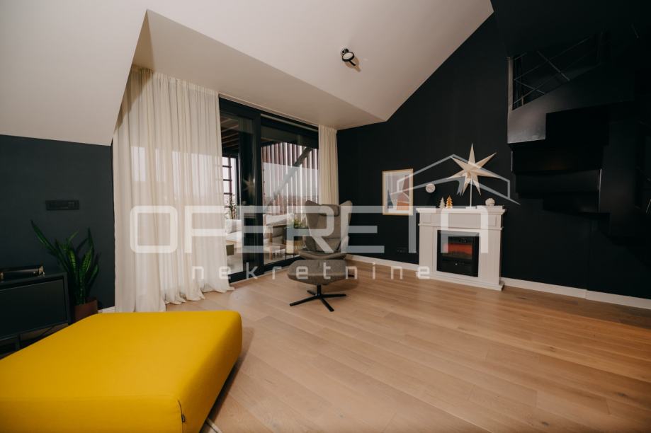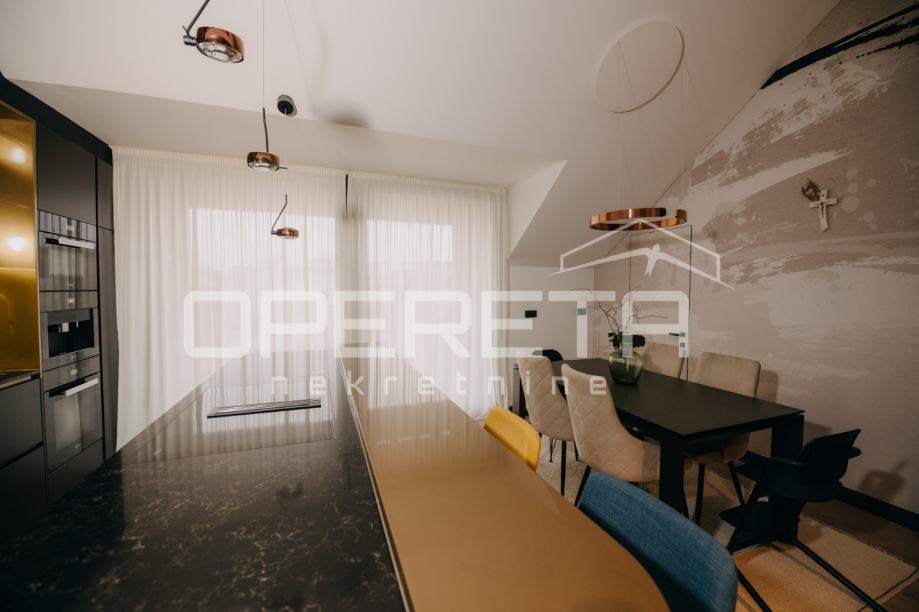 U urbanoj vili iz 2018. godine, sa 8 stanova, prodaje se kompletno namješteni 4sobni penthouse, na 3. katu od 3, do kojeg direktno iz garaže vodi lift.