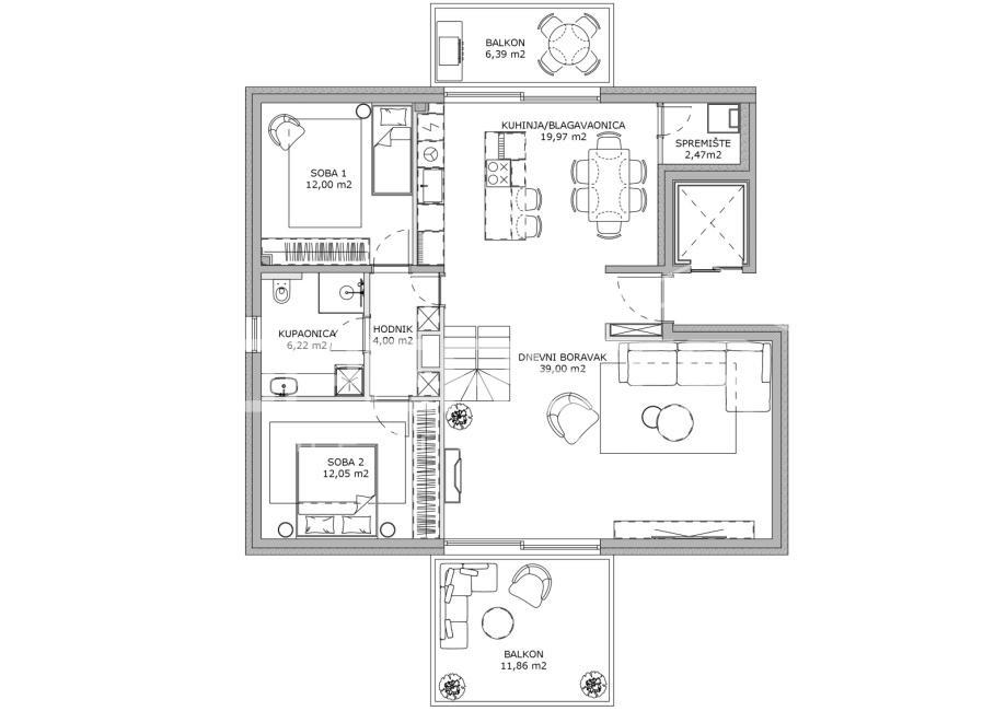 Penthouse se prostire na 2 etaže, sveukupno podne grijane površine 125,82 m2, s 2 natkrivena balkona ( 12,59 m2 i 7,12m2 ).