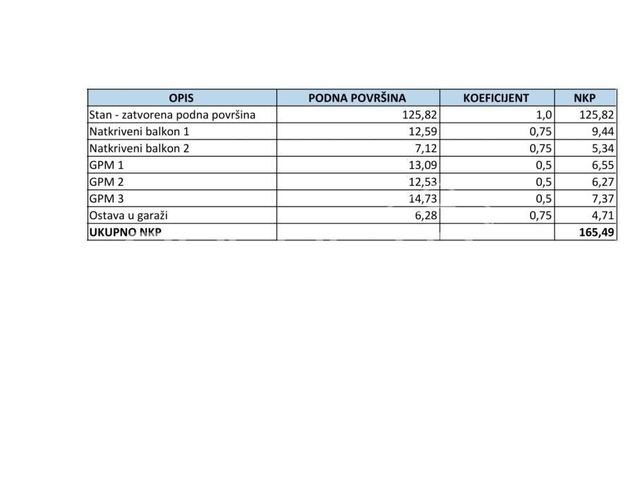( 13,09; 12,53 i 14,73 m2 ), te spremište uz garažu ( 6,28 m2), što je obračunski ukupno po koeficijentima 165 m2.