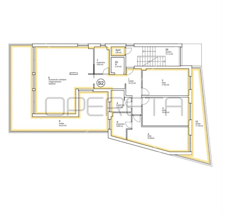 Četverosoban stan na prvom katu zatvorene površine 136,80 m2 s dvije natkrivene terase 52,23 m2 i 17,16 m2 (37,30), parkirnim mjestom u garaži, spremištem 10,77 m2, vanjskim pm. Ukupno obračunski NKP 190 m2.