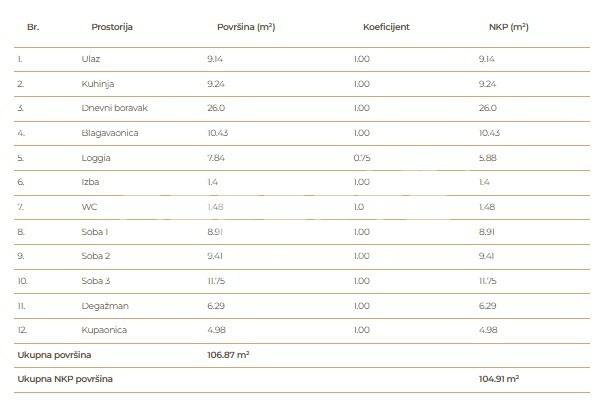 Prostrani trosobni stan sastoji se od tri spavaće sobe, kupaonice, wc-a, hodnika, dnevnog boravka s kuhinjom i blagovaonicom, degažmana, izbe i loggie.